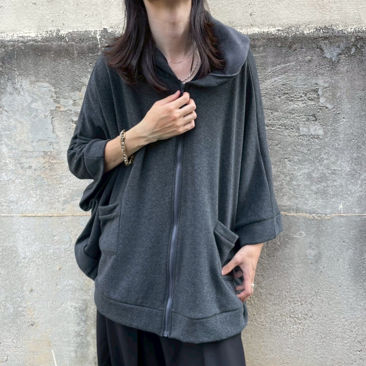 立体的なダンボールニット生地を使用した、モモンガのようなワイドシルエットが特徴のジップフーディ。