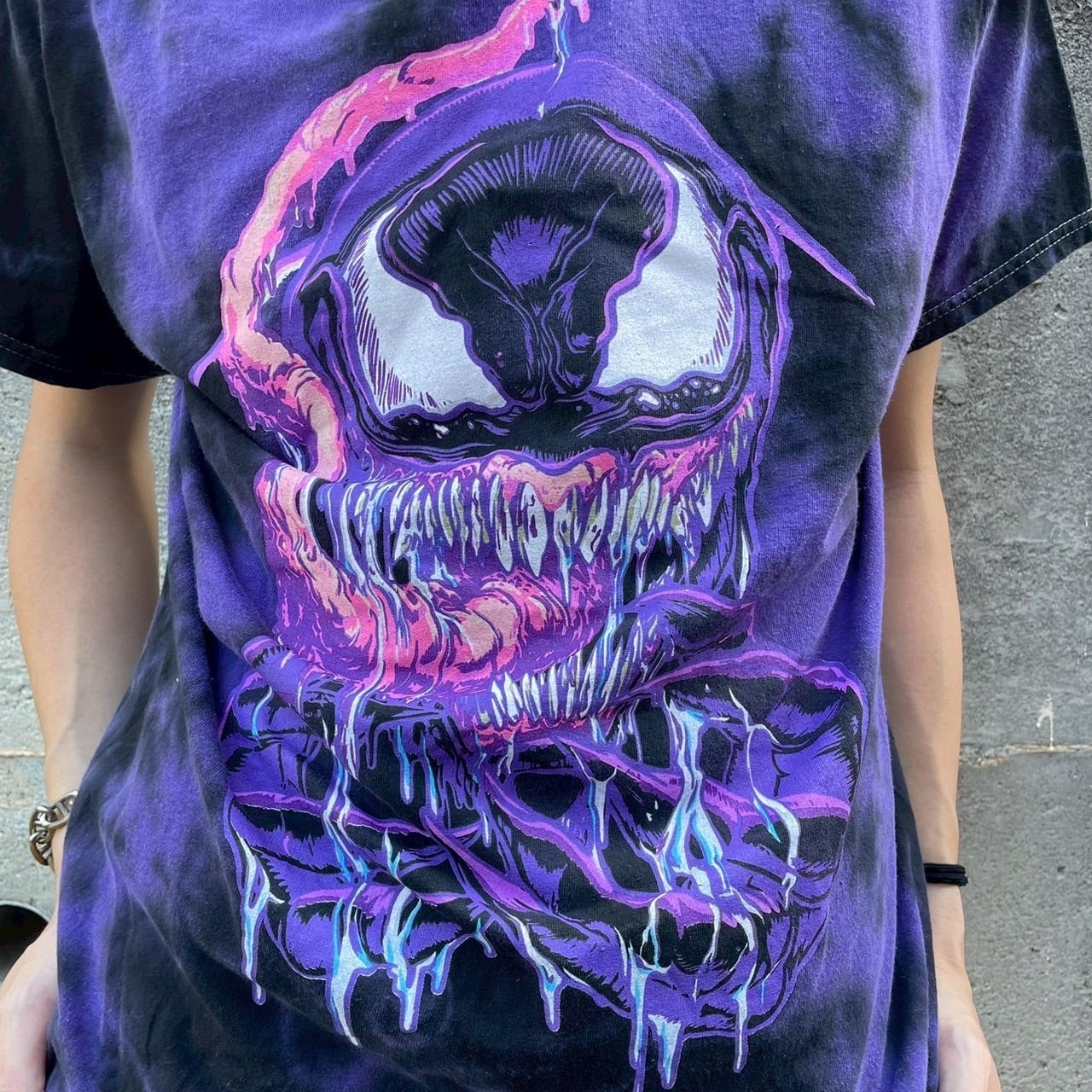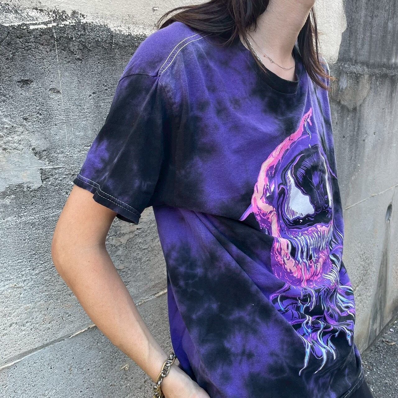 パープルとブラックをベースにしたタイダイ染めのボディに、迫力あるヴェノムの表情と鮮烈なピンクの舌が映えるデザイン。