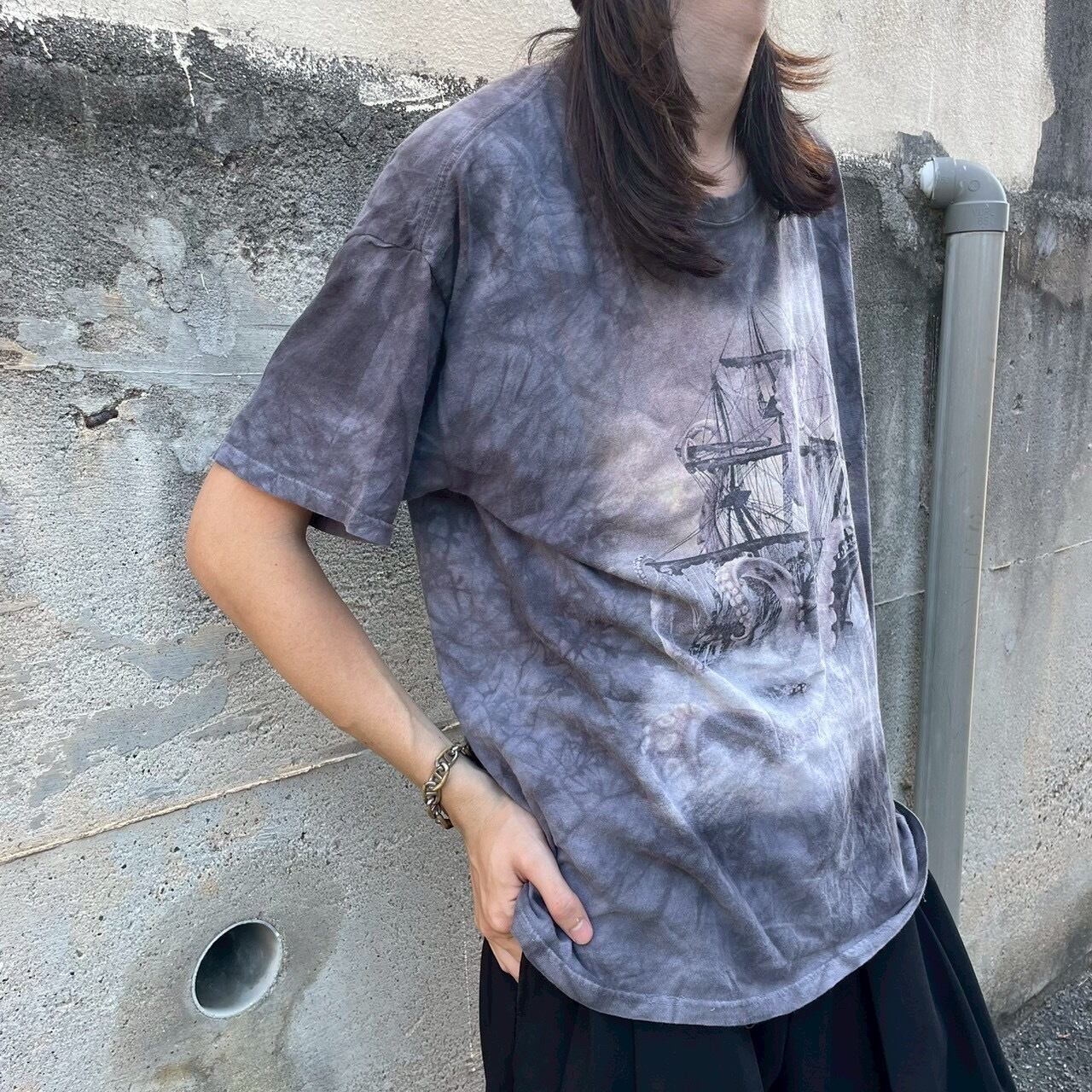 迫力あるクラーケン(海の怪物)が帆船を襲うグラフィックが大胆にプリントされたタイダイTシャツ。