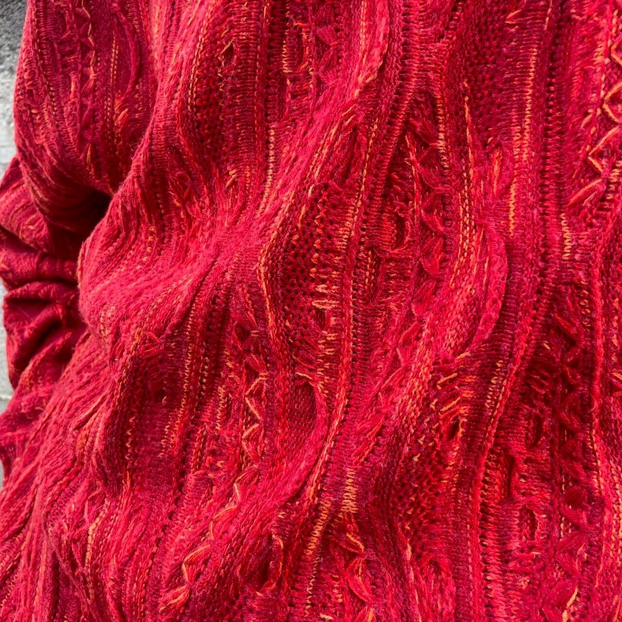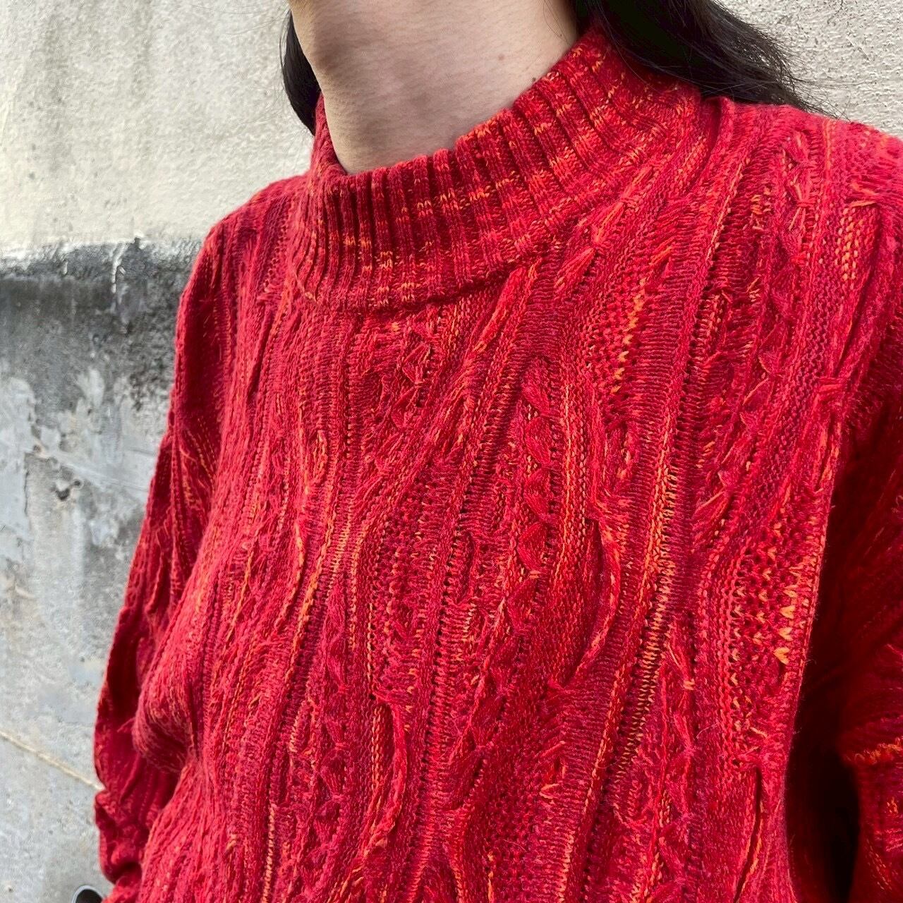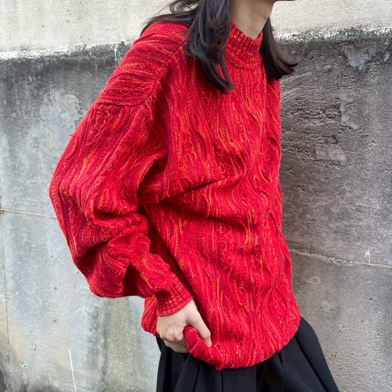 鮮烈なレッドを基調に、立体的な編み柄が際立つ3Dアクリルニットセーター。