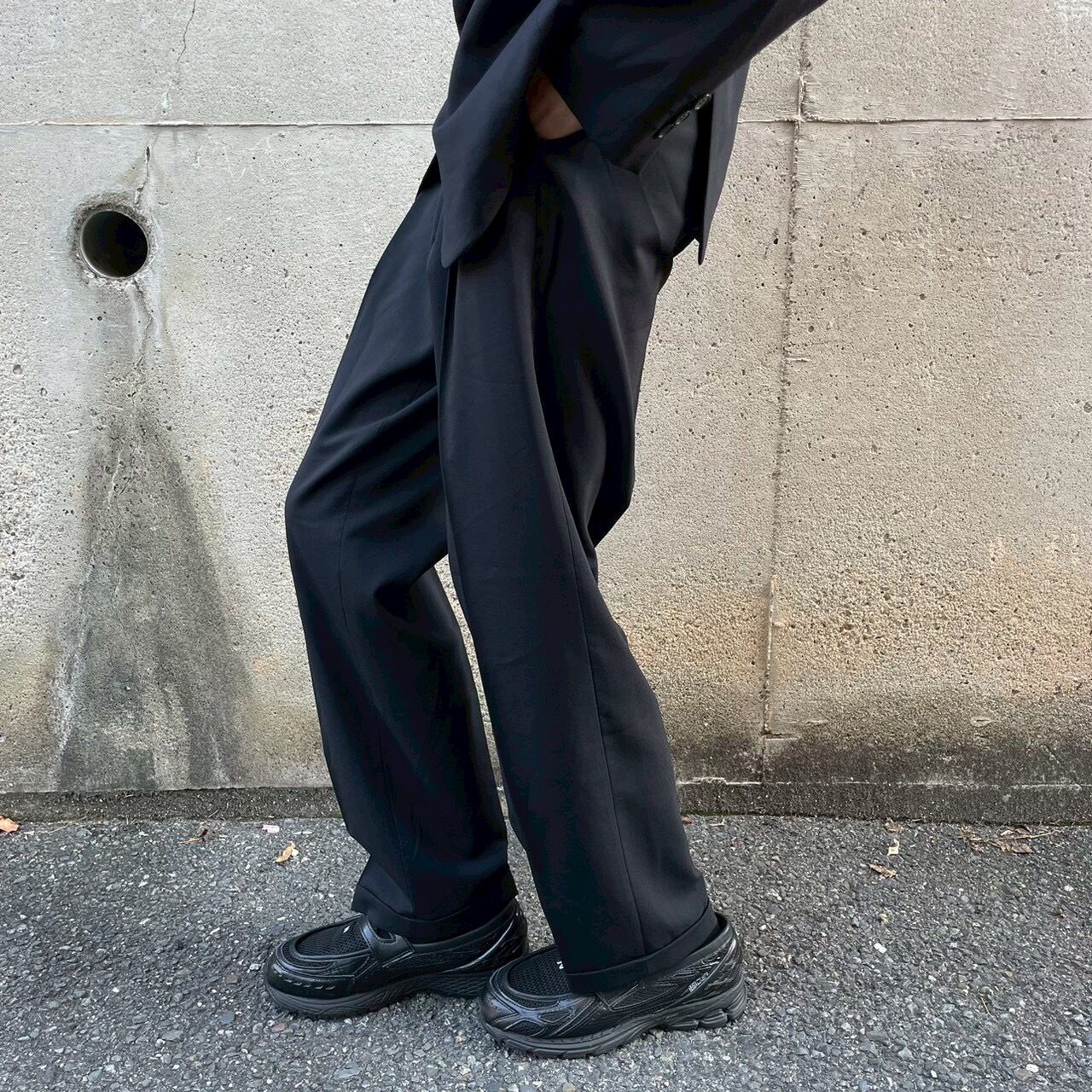 深みのあるブラックカラーに、3Bシングル仕様のジャケットと程よいワイドシルエットのスラックスが組み合わされた一着です。ピークドラペルの立体感ある仕立てにより、モードな雰囲気を演出。軽やかで滑らかな生地感はフォーマルにもカジュアルにも対応し、現代的なスタイリングに落とし込めます。