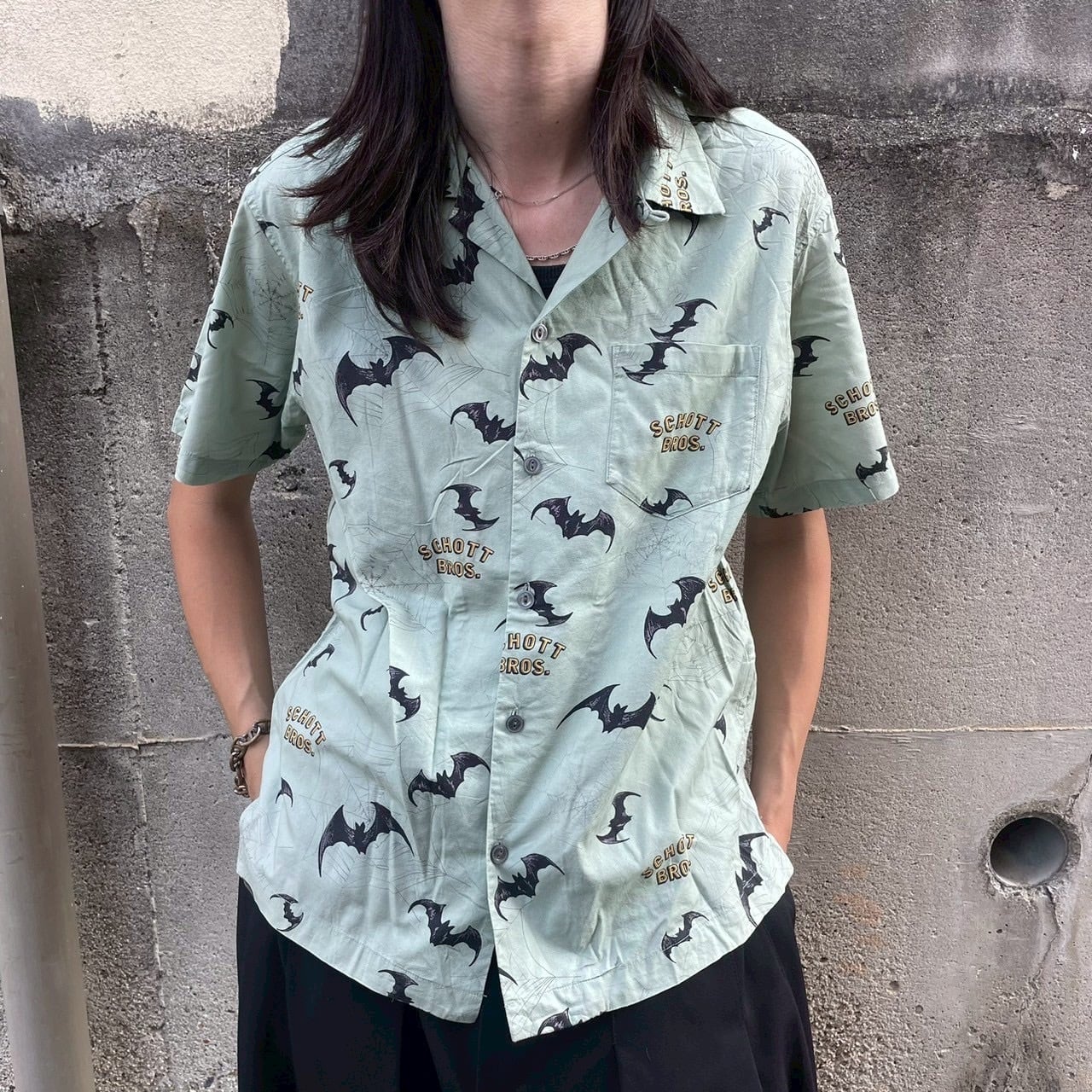淡いミントグリーンをベースに、ブラックのバットモチーフと「SCHOTT BROS.」ロゴがリズミカルに配置され、ストリートとレトロなムードを兼ね備えた仕上がりです。