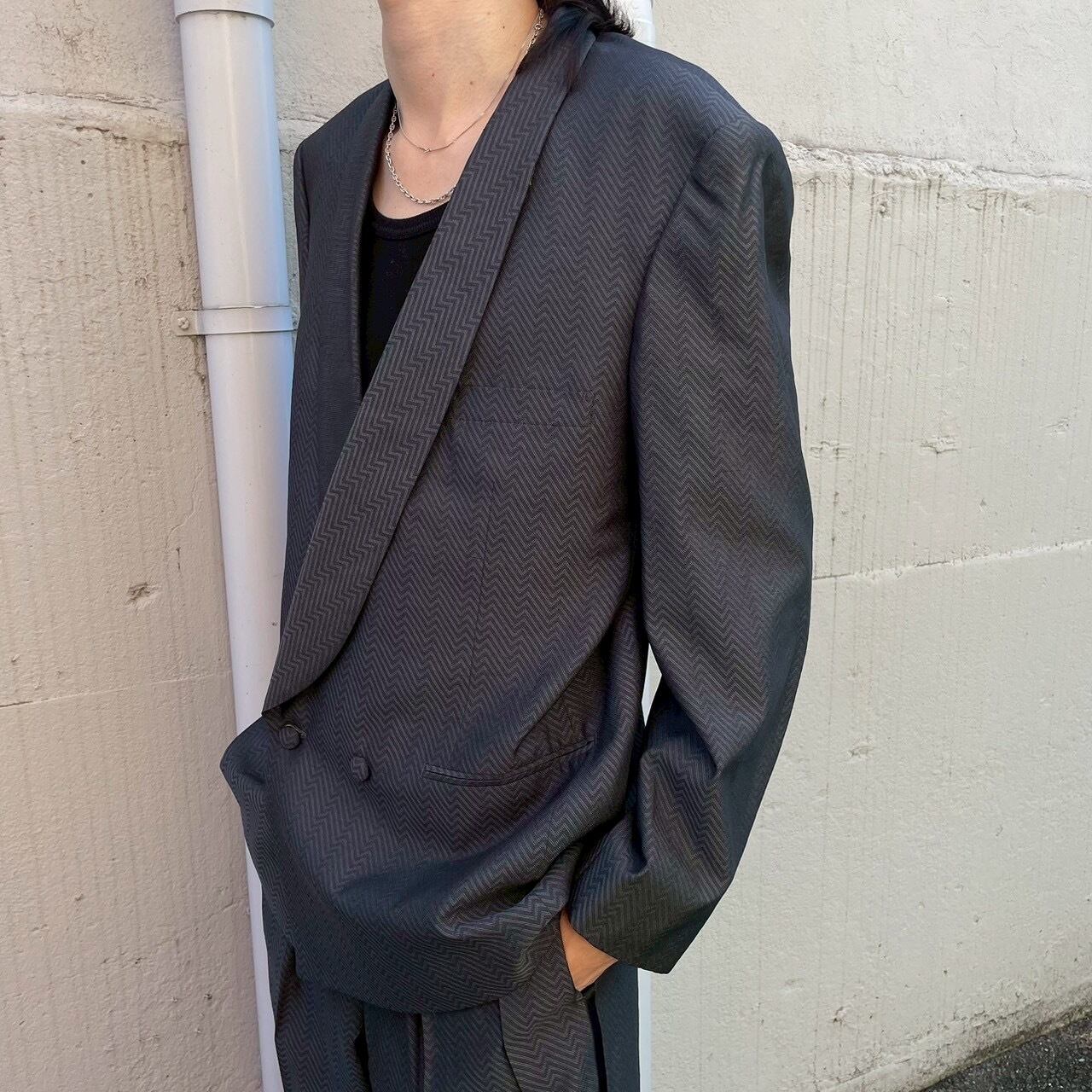 モードな雰囲気漂うショールカラーのダブルブレストセットアップ。深くカーブを描くラペルラインが特徴的で、上品かつエッジの効いたスタイルを演出します。グレートーンの生地は細かなヘリンボーン柄が織り込まれており、角度によって表情を変える奥行きのある質感が魅力。ジャケットはリラックス感のあるボクシーシルエット、パンツはツータック入りで腰回りに余裕を持たせつつ、綺麗に落ちるワイドストレートシルエットに仕上げられています。フォーマルからモードなスタイリングまで幅広く対応できる、存在感抜群の一着です。