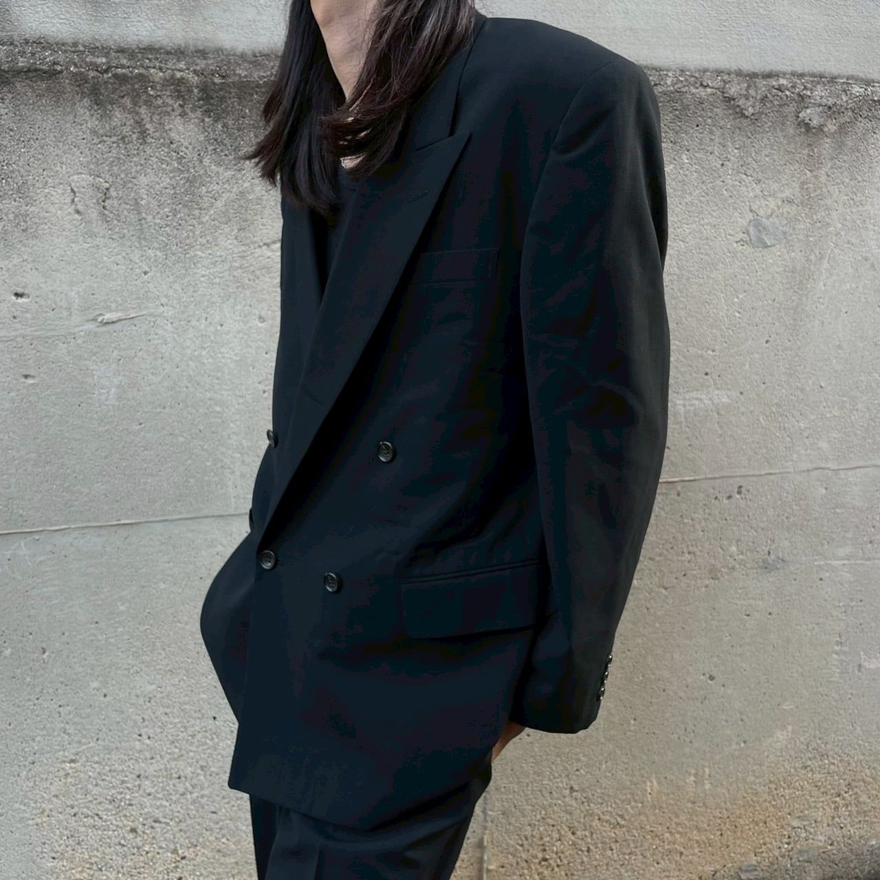 深みのあるブラックウールを用い、ジャケットは力強いショルダーラインとリラックスしたドレープを併せ持ち、ボトムはタック入りのストレートシルエットで構成。クラシックなテーラードの要素を保持しながらも、全体に漂うのは90年代特有のゆとりと削ぎ落とされた実用性です。