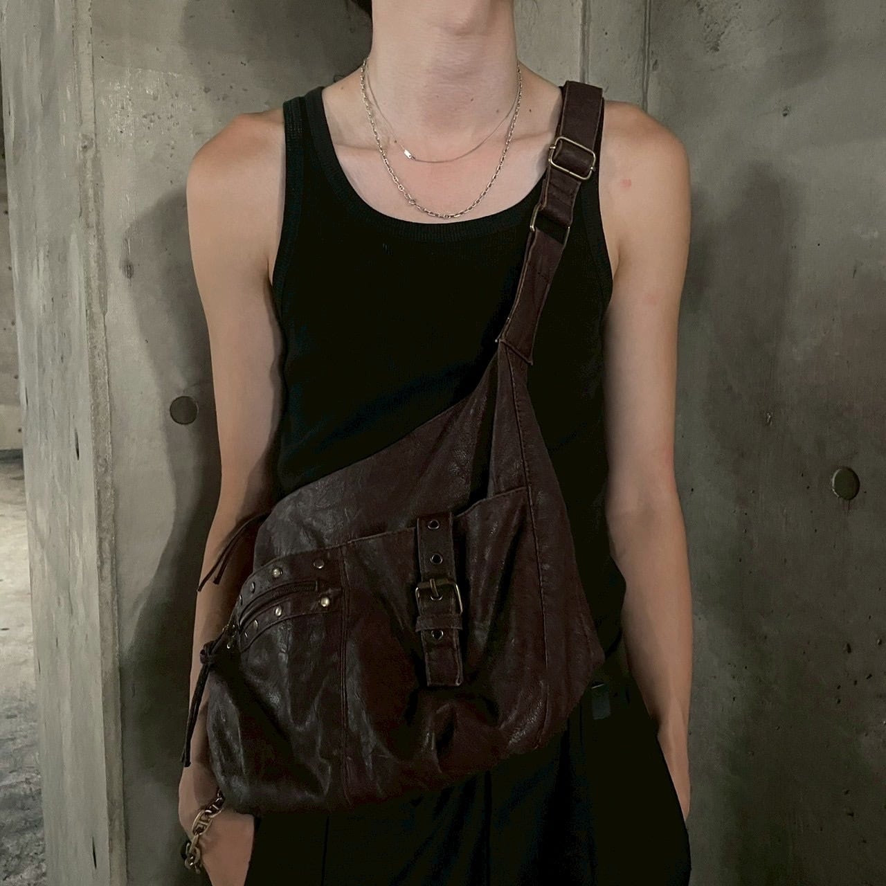大きめの容量で財布やスマートフォンはもちろん、日常使いに十分な収納力を備え、ワンショルダー仕様でラフに持ち運べるのも魅力。柔らかく経年変化を感じるレザーの質感が、スタイリングにグランジやモードなニュアンスを加えてくれます。