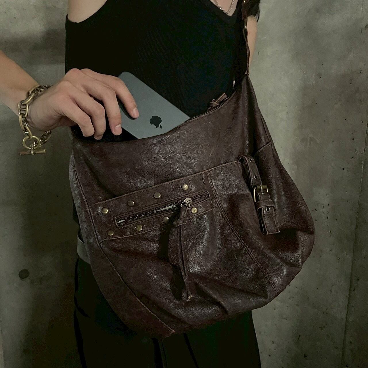 〖vintage〗Leather Buckle & Studs Shoulder Bag