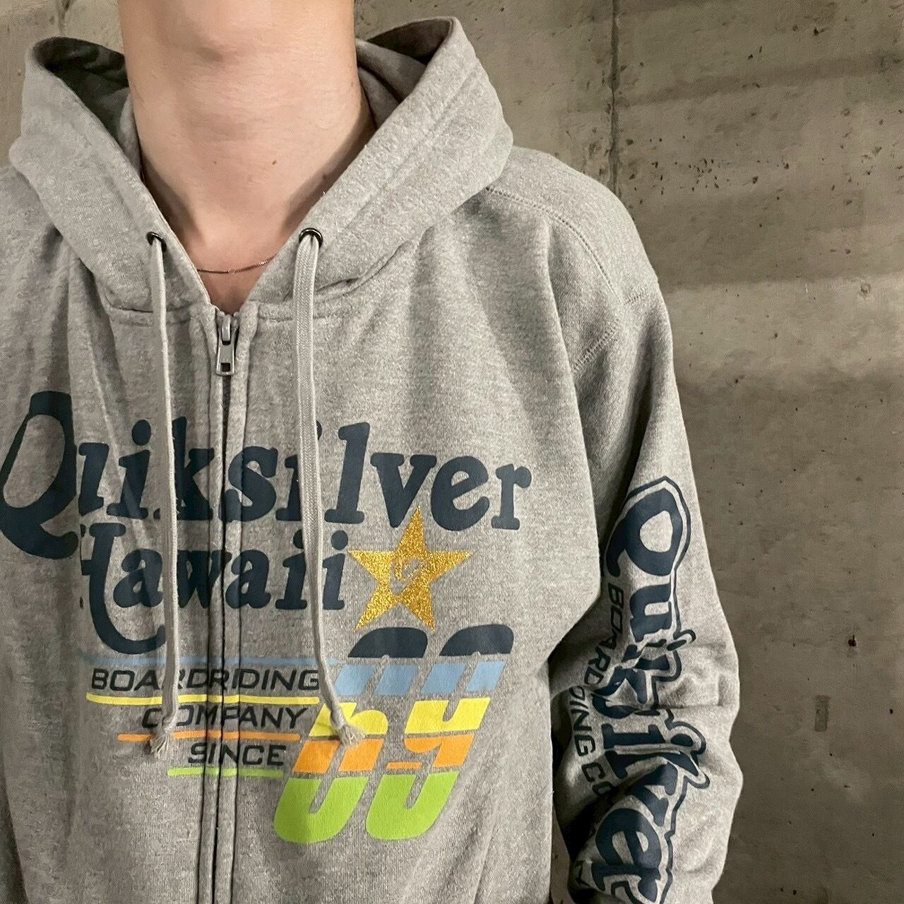 フロントには「Quiksilver Hawaii」のロゴとスター、カラフルなグラフィックを大胆に配置。さらに両袖やバックにもプリントが入った、90s〜00sのサーフカルチャーを色濃く感じさせるデザインです。