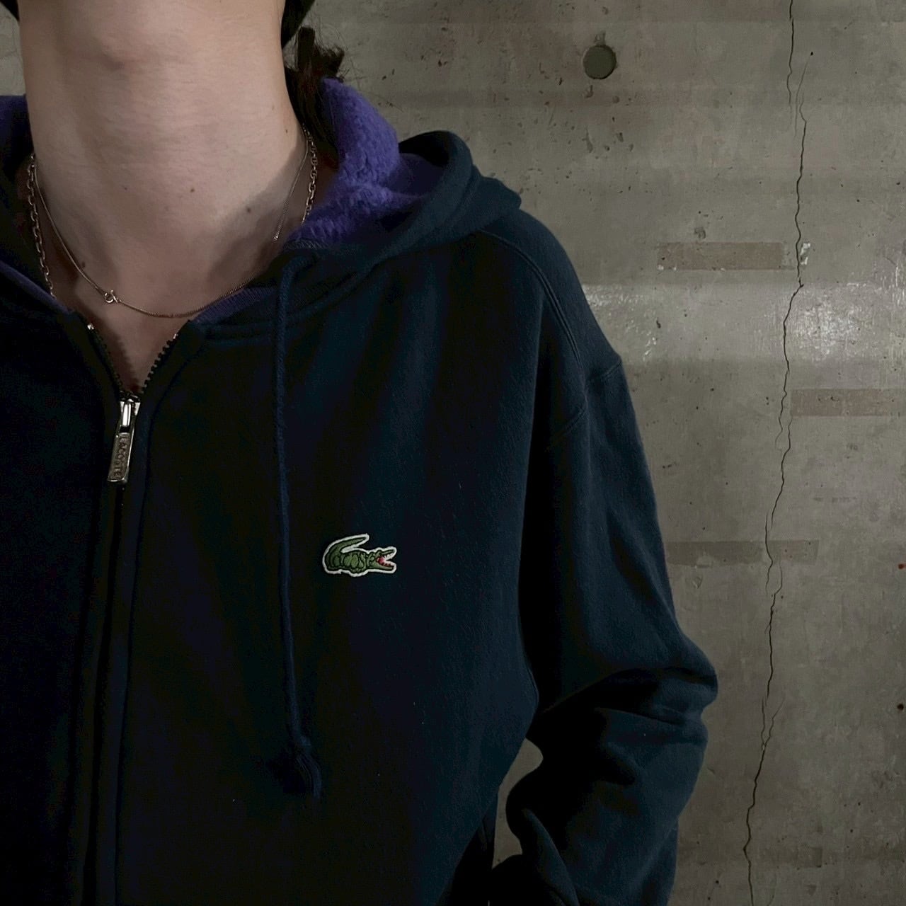 胸元にはアイコニックなワニのワンポイントロゴ、背面には存在感のあるブランドロゴをオン。フード内側にはパープルのフリースをあしらい、さりげなく遊び心の効いたカラーアクセントになっています。