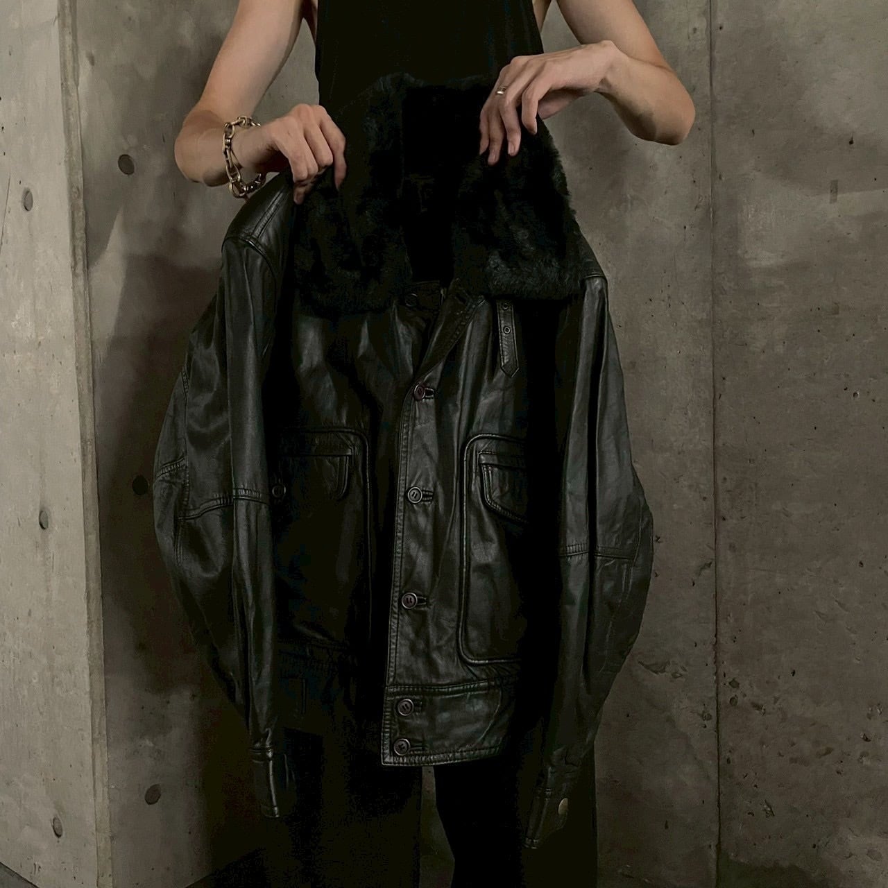 特徴的なムートン調の襟が上品なボリュームを演出し、ジップやボタンの金属パーツが無骨な存在感を強調。