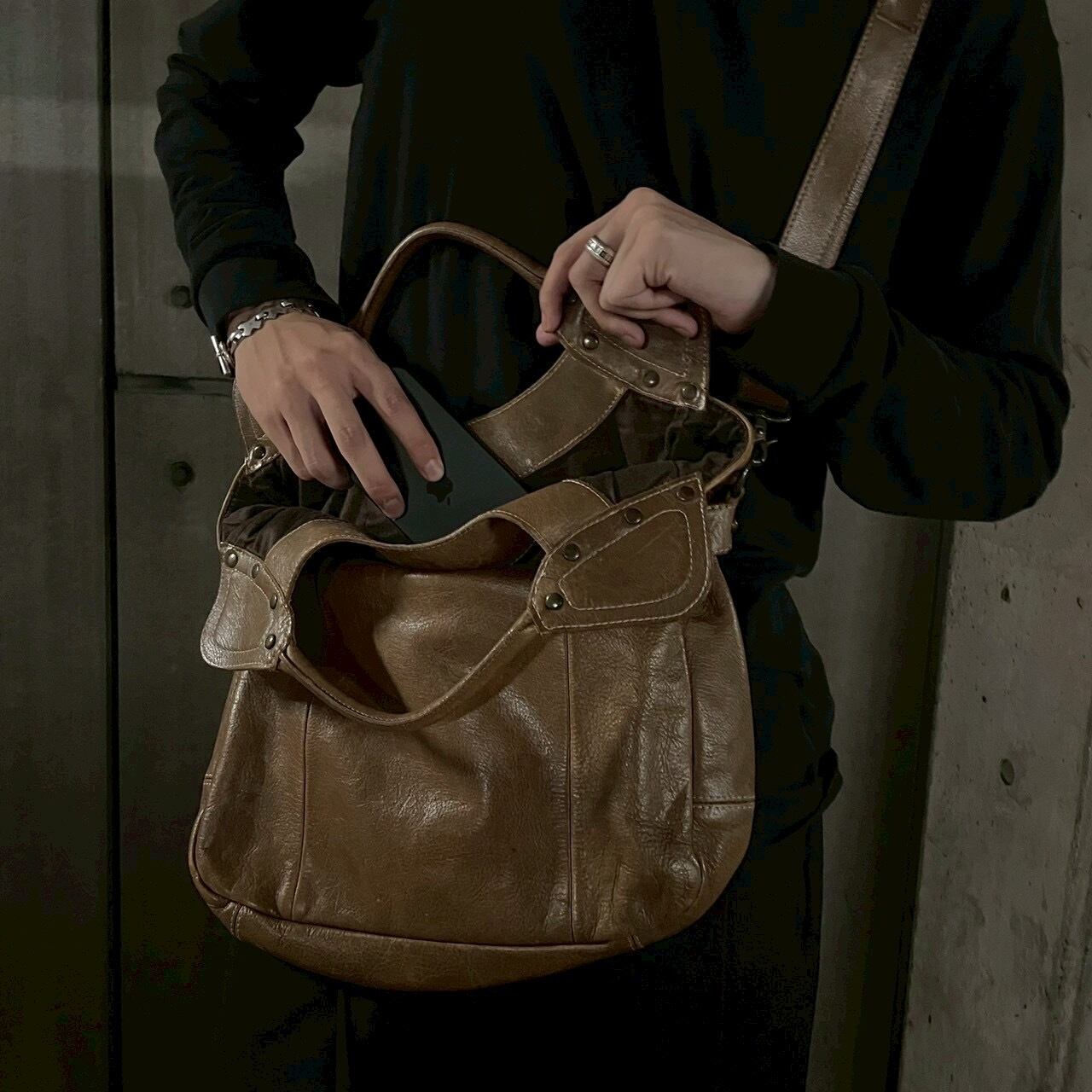 ヴィンテージライクな質感が魅力の、スタッズ付き2WAYレザーバッグ。
