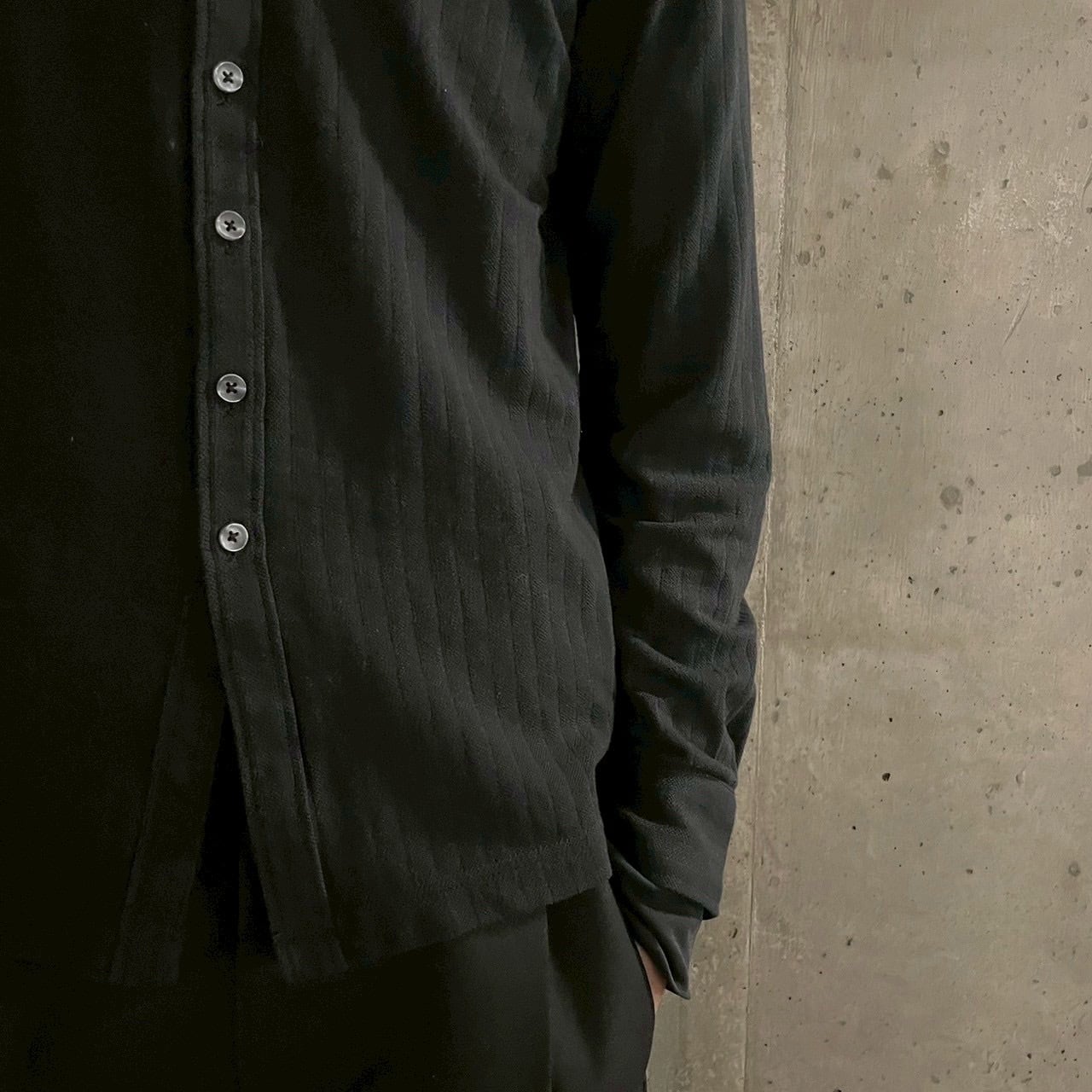 表面にさりげない凹凸のある特殊テクスチャー生地を採用したブラックシャツ。