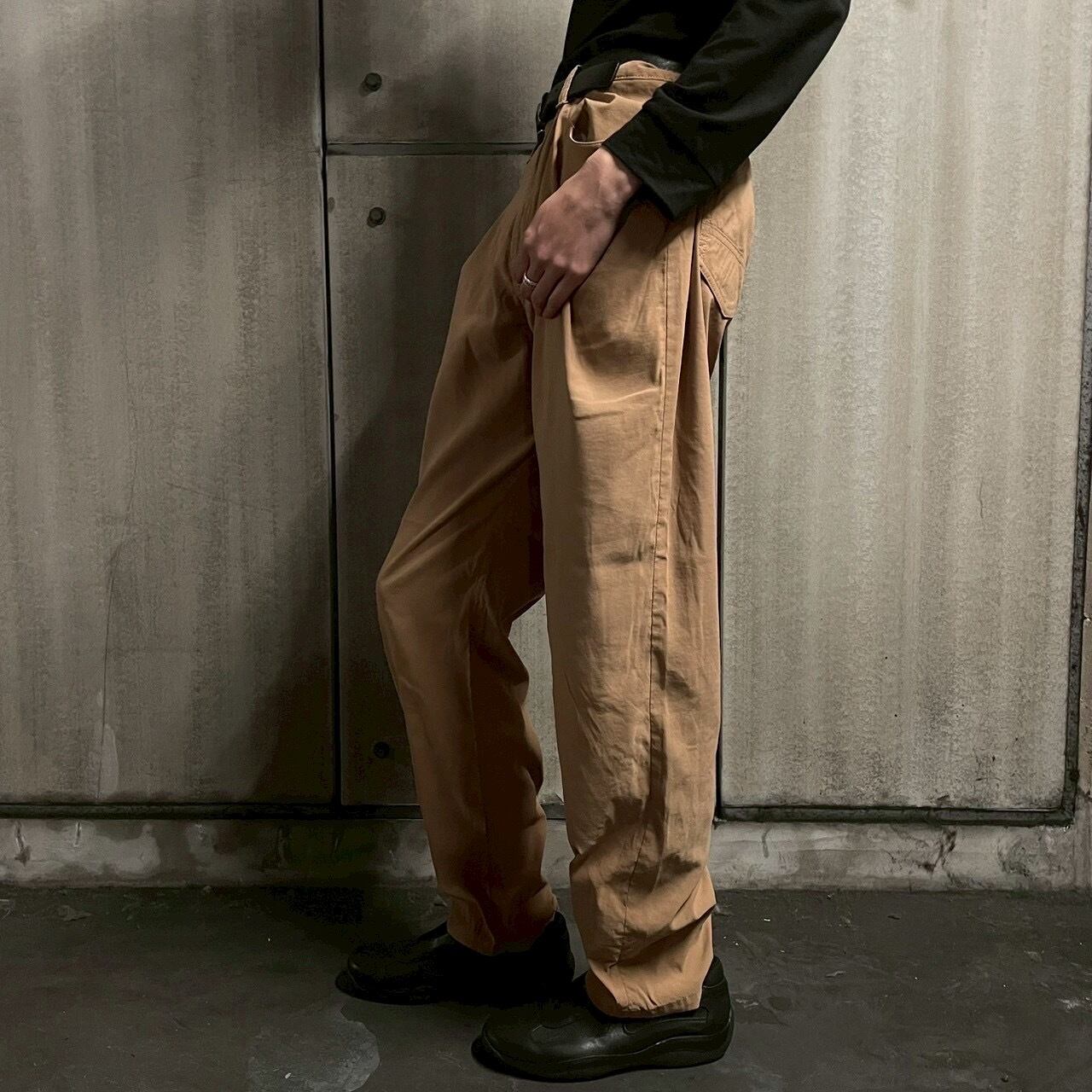 ややワイドな腰回りから、裾にかけて自然に細くなるテーパードシルエットが特徴で、タウンユースにも馴染む一本。