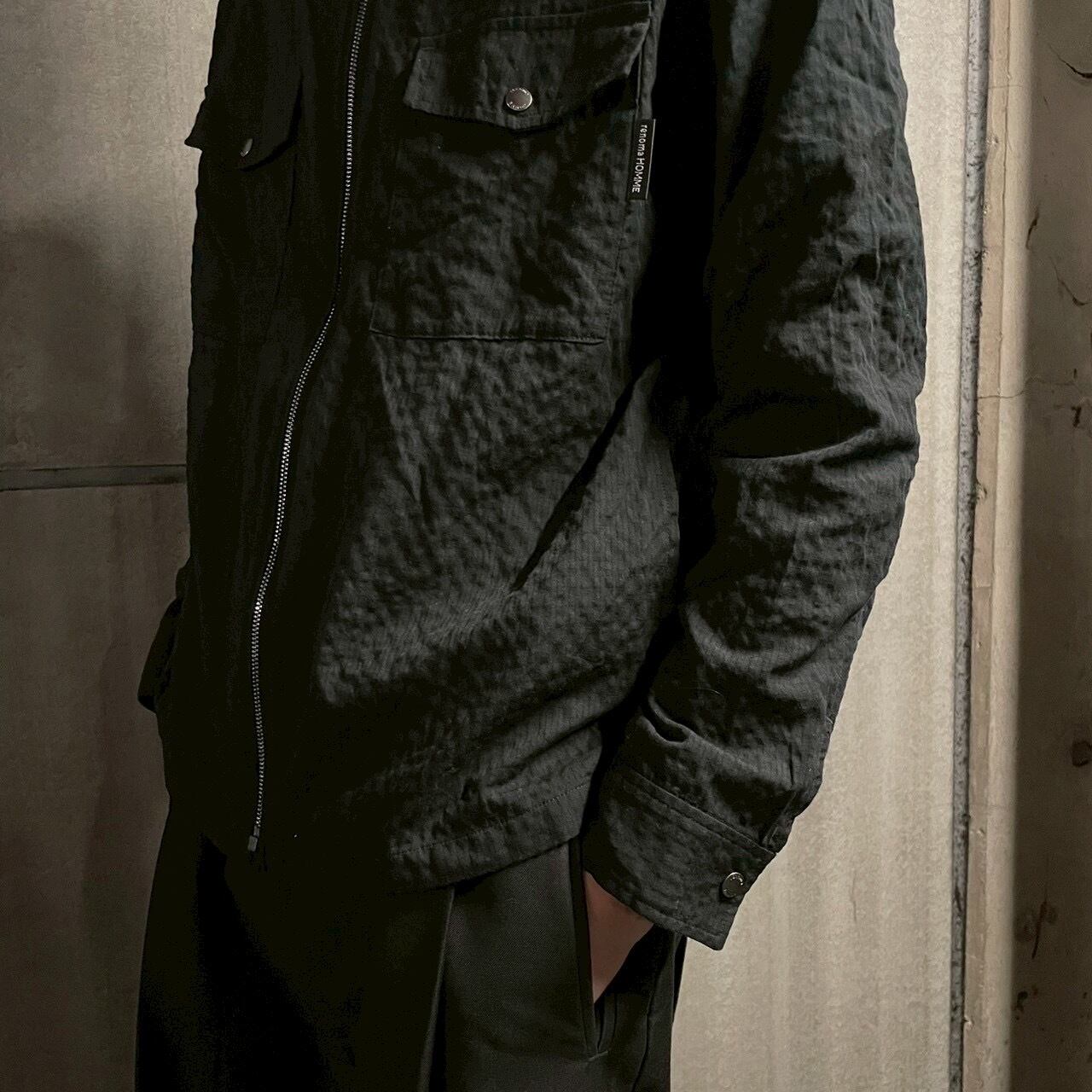 無駄を削ぎ落としたフラップポケットと直線的なシルエットが特徴で、ブラックの単色ながら生地表面の表情がスタイリングに陰影を与えます。