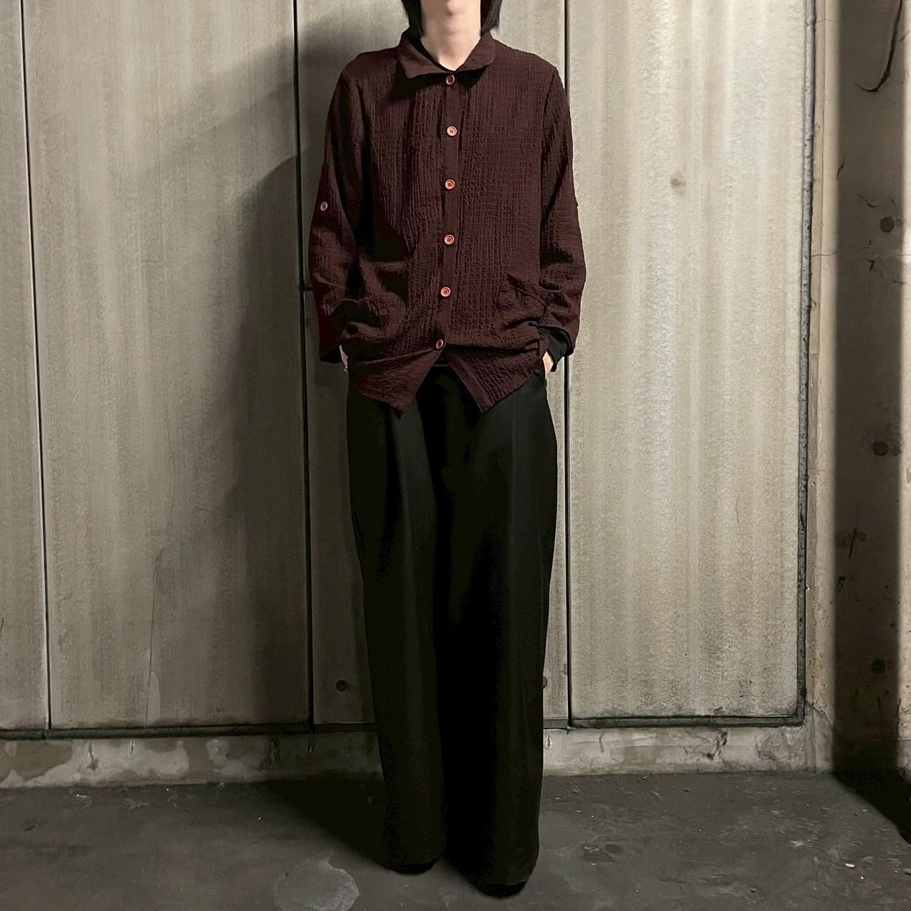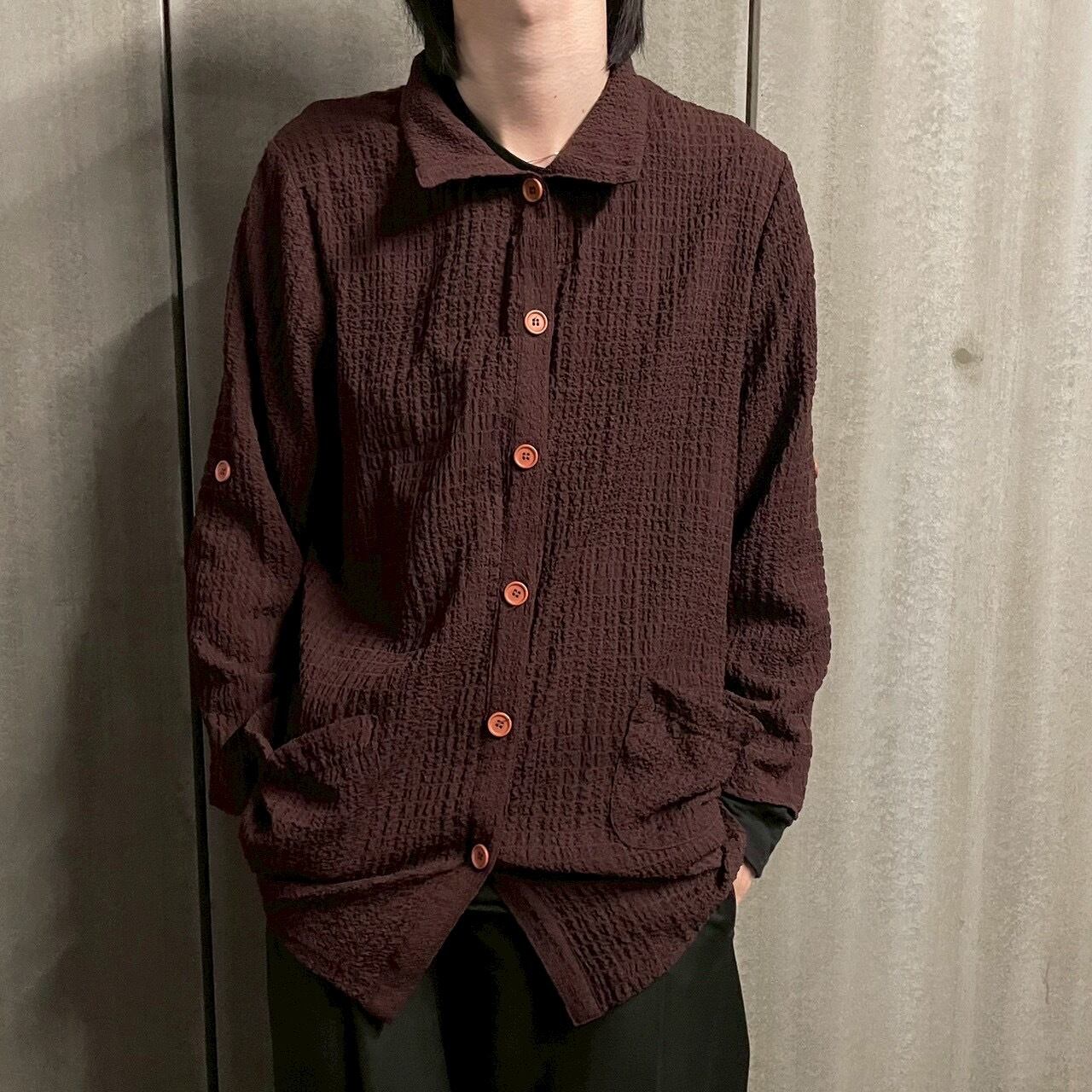 生地全体にランダムに走る縮緬のような表情が、単体で着ても存在感を放つ一枚。