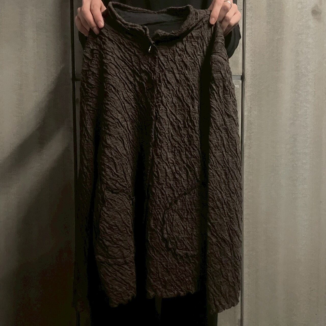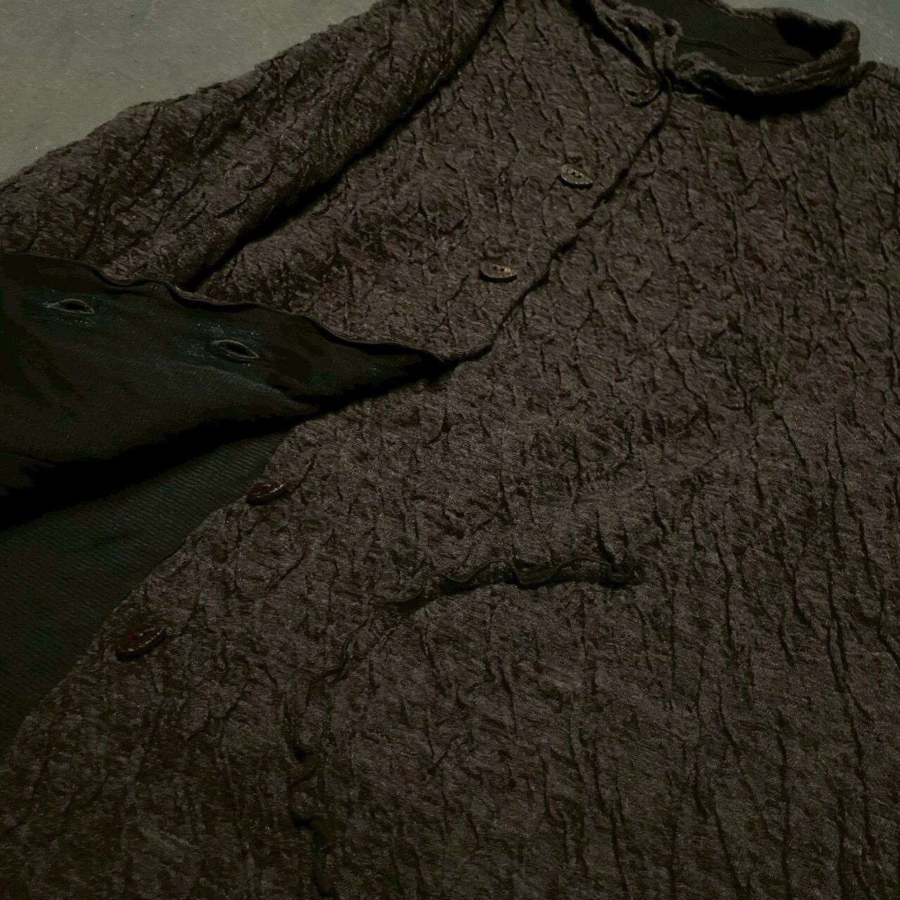 細かくランダムに走るシワ加工が、陰影のある立体感を生み、シンプルなシルエットながら存在感を発揮します。