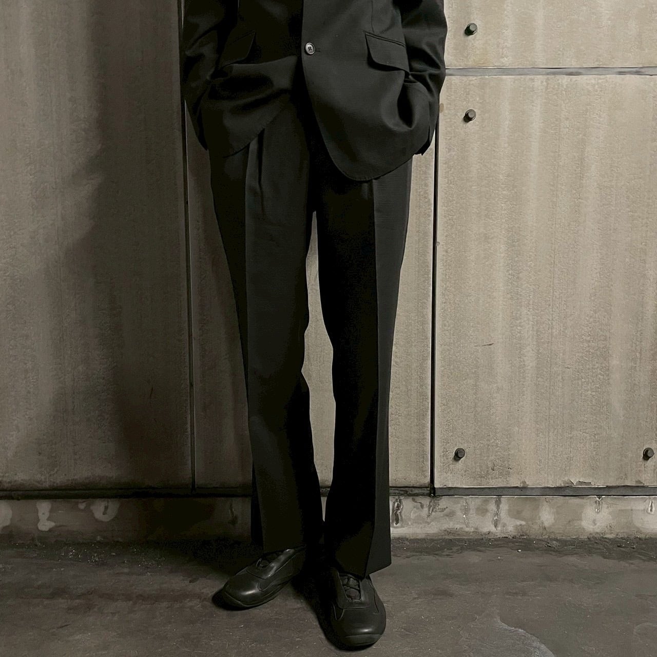 パンツはワンタックのストレート寄りワイドシルエットで、流れるような落ち感が特徴。オケージョンにもモードにも振れる一着。