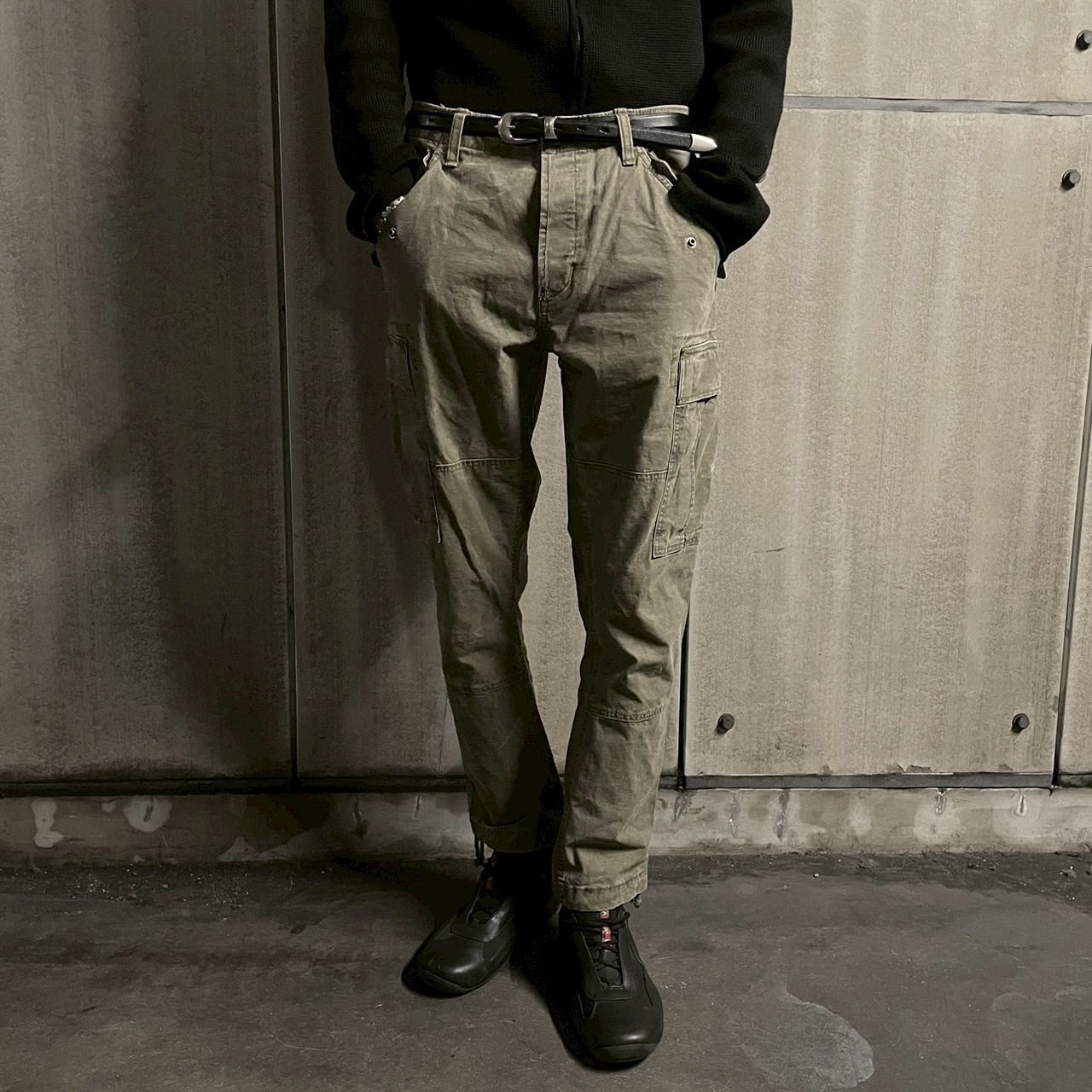 程よい色落ちを感じさせるカーキのコットン地は柔らかく、穿き心地も抜群。サイドのカーゴポケットやバックのフラップポケット、ウエストのボタンタブ、リベットの打ち込みなど、細部に至るまでブランドらしい高い完成度が光ります