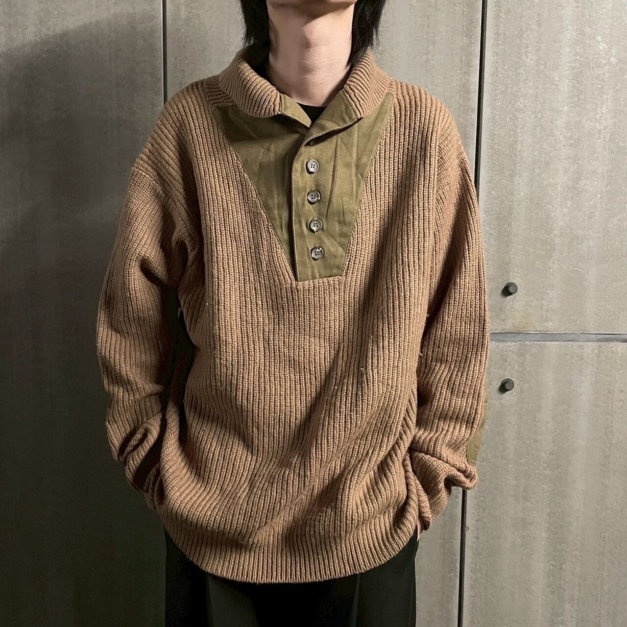 前立てとエルボーパッチにはミリタリーウェアを彷彿とさせるオリーブのコットンファブリックを採用し、肉厚なローゲージのウールボディと絶妙にマッチ。