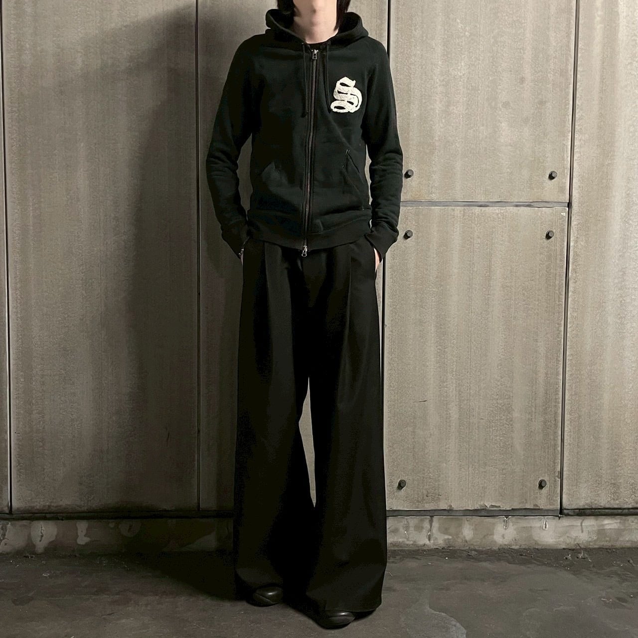 存在感のあるスカルパッチがバックに大胆に配されたダブルジップ仕様のフーディ。フロントには立体的なSモチーフ、背面には「UNIVERSITY OF PLUS BY STUDD」のエンブレム風ロゴとドクロの刺繍が印象的に配置されており、ストリート×パンクのムードを融合。ダブルジップの仕様により、着こなしのアレンジも自在に。ややタイトめなシルエットで、インナー使いから一枚着としても着映えする1着。