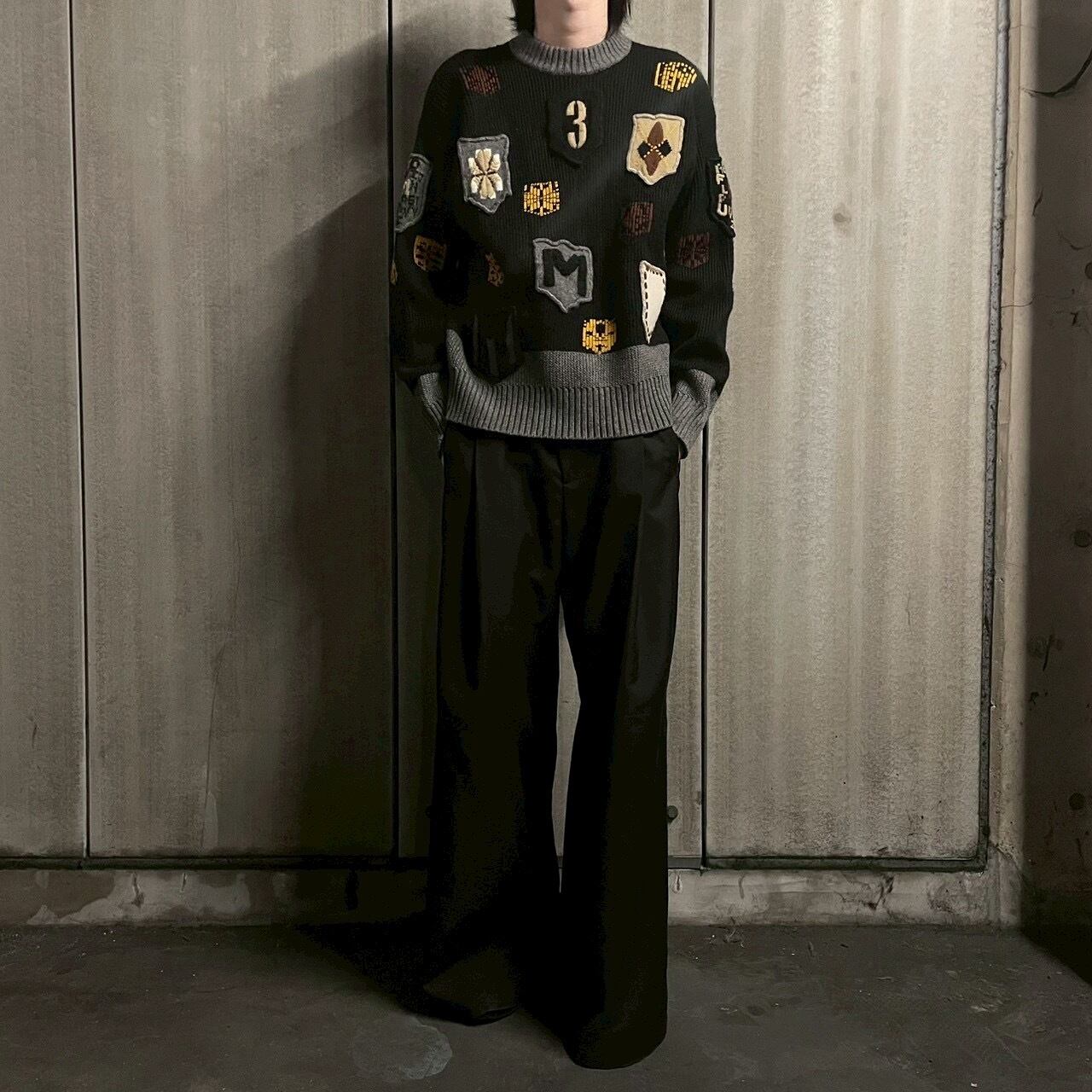 ベースは深みのあるブラックボディに、襟・裾・袖口をチャコールグレーの配色リブで切り替え。そこにMロゴ、数字、アーガイル調の盾モチーフなど多彩なパッチを散りばめた、唯一無二のグラフィック感。