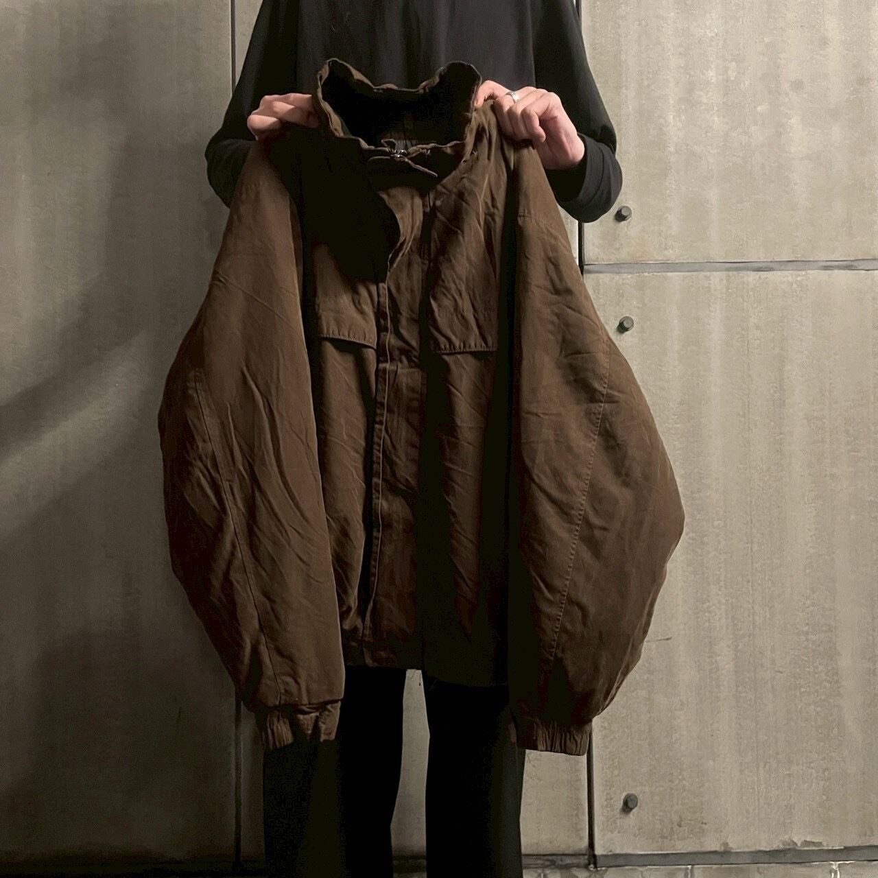 身幅にゆとりを持たせたボリュームシルエットに加え、袖口のベルクロ・裾のドローコード・フロントのフラップなど随所にテープ仕様を採用。