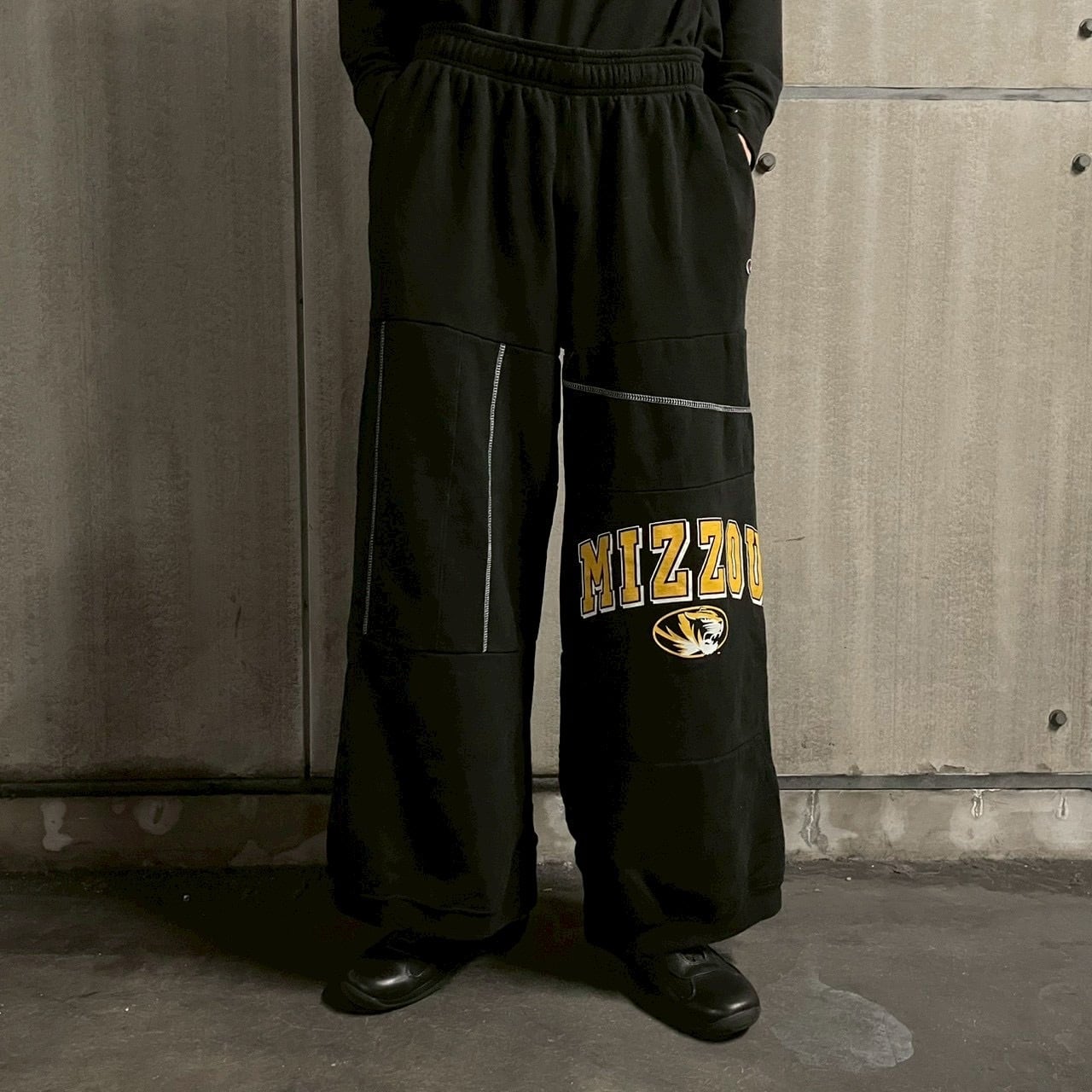 USスウェットパンツをベースに再構築された、ドッキング仕様のオーバーダイスウェットパンツ。