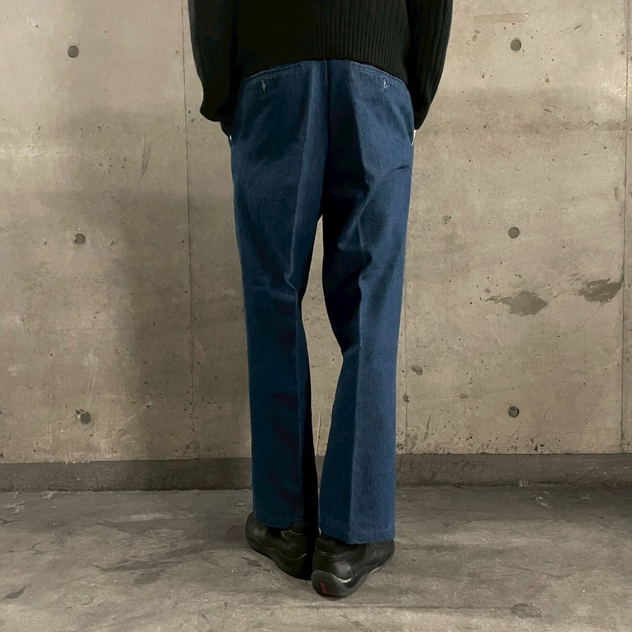 フロントに入る深めのプリーツが立体感を生み、デニム素材でありながらスラックス然とした上品な佇まいを実現しています。