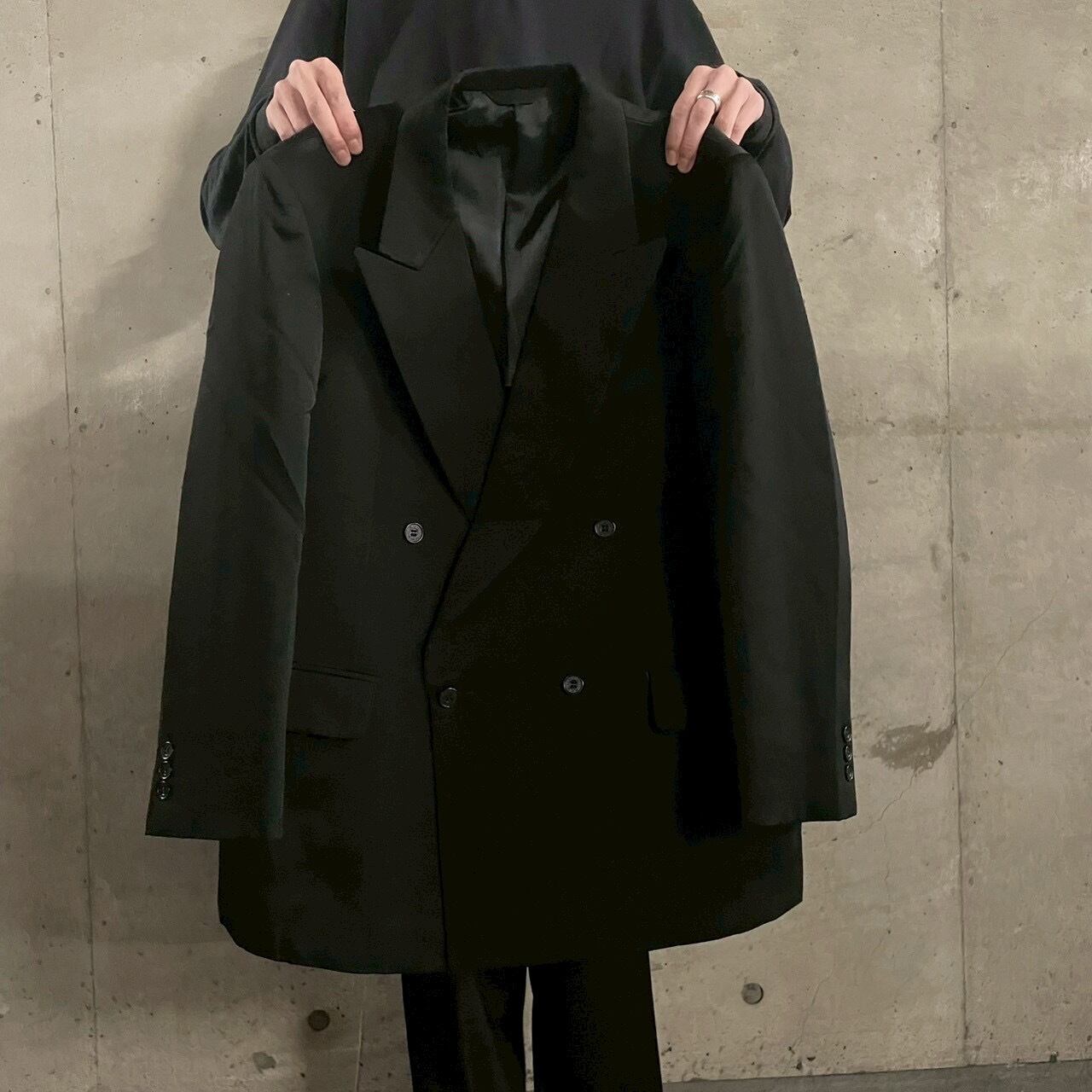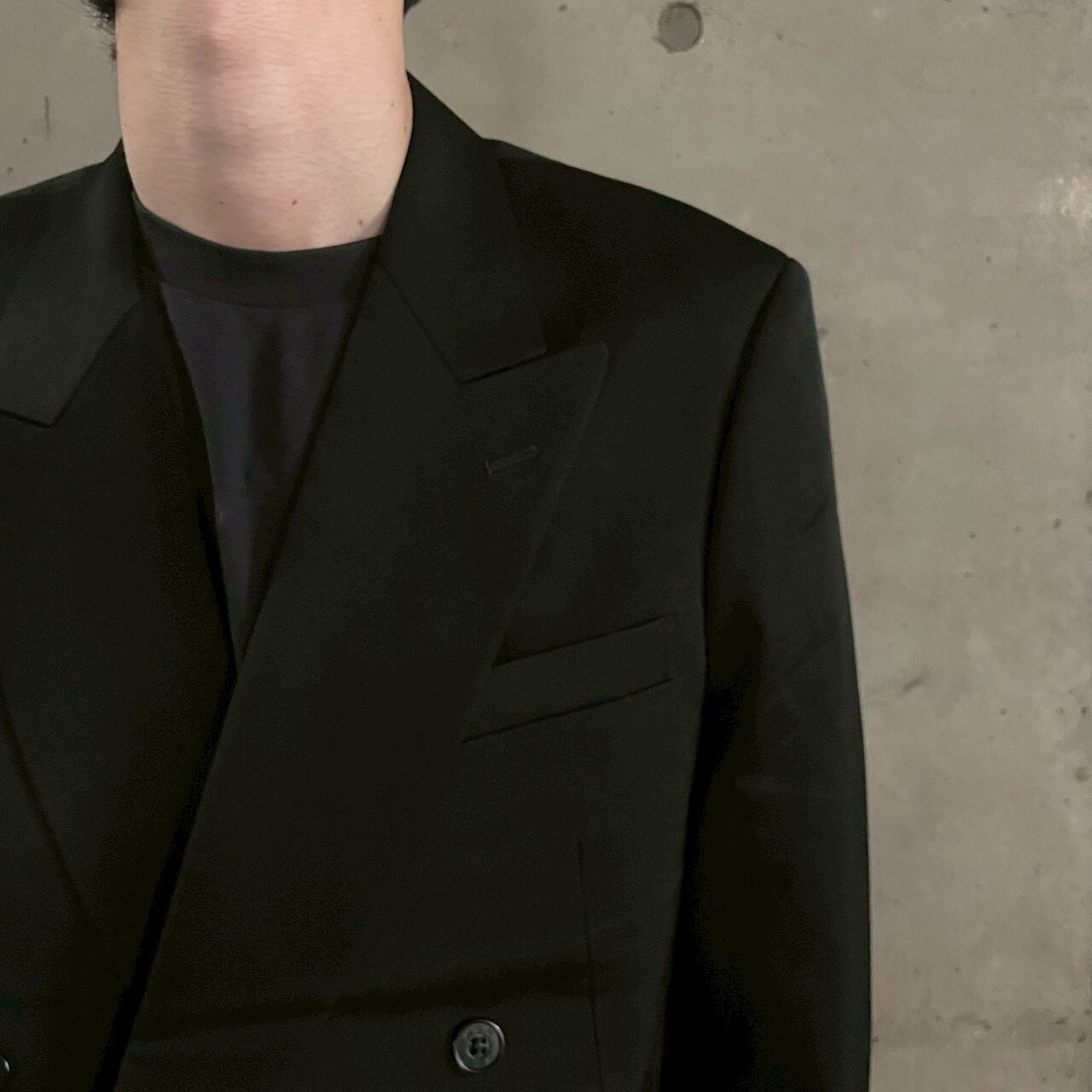フロントは2B仕様ながら、打ち合わせを深く取った構築的なダブルブレストデザインが特徴で、クラシックとモードのバランスが非常に美しい一着です。