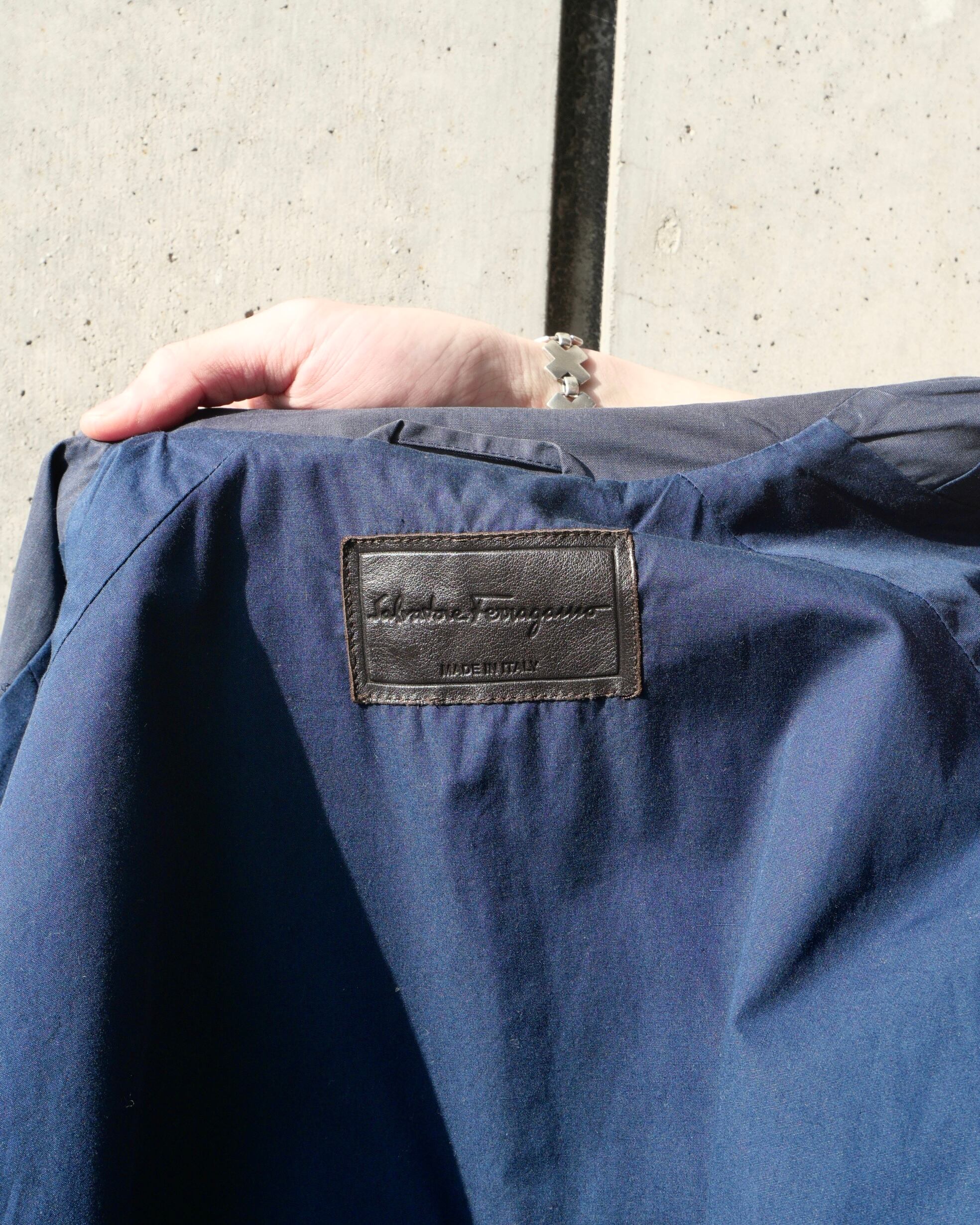 しなやかなコットンボディをベースに、襟元・袖口・ウエスト調整部分・ポケット縁へレザーを配した切り替えデザインが特徴です。異素材のコントラストが控えめながらも確かな存在感を生み、当時のフェラガモらしい機能美とエレガンスが共存しています。