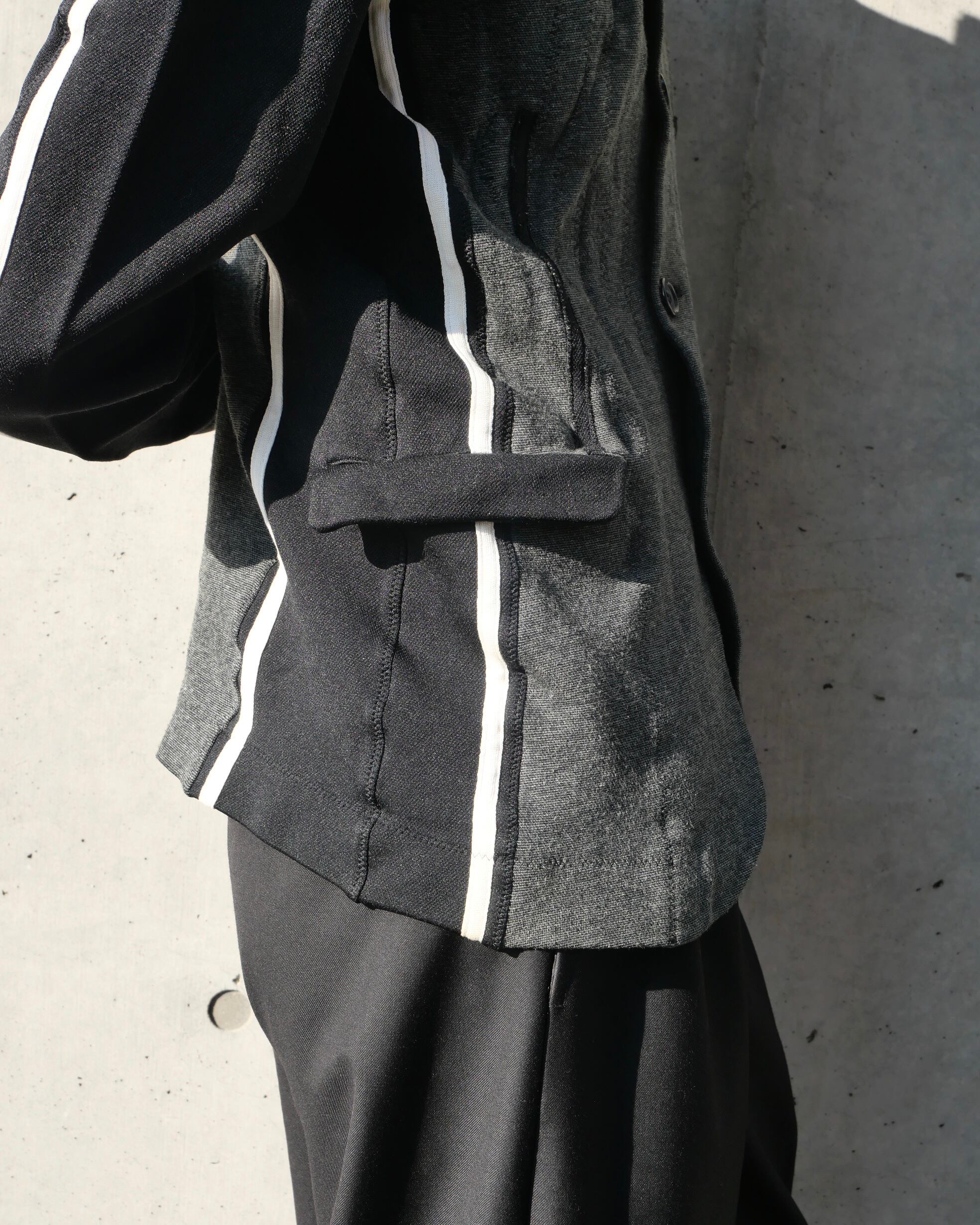 伸縮性のあるジャージ素材をベースに、前立てはボタン仕様、身頃はテーラード由来の立体的なパターンで構築。