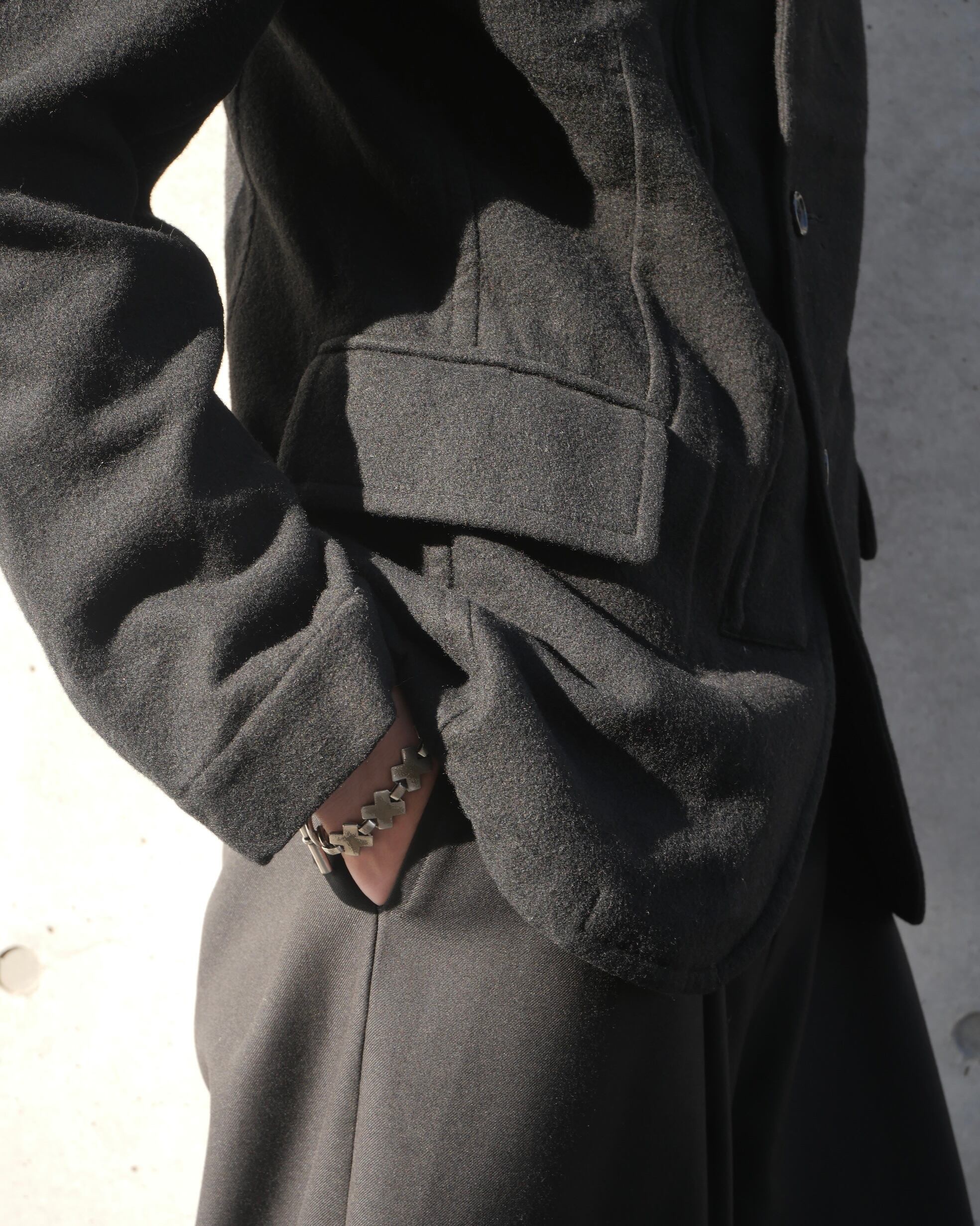 メルトンウール特有のしっかりとした生地感が、構築的なシルエットを美しく保ちます。