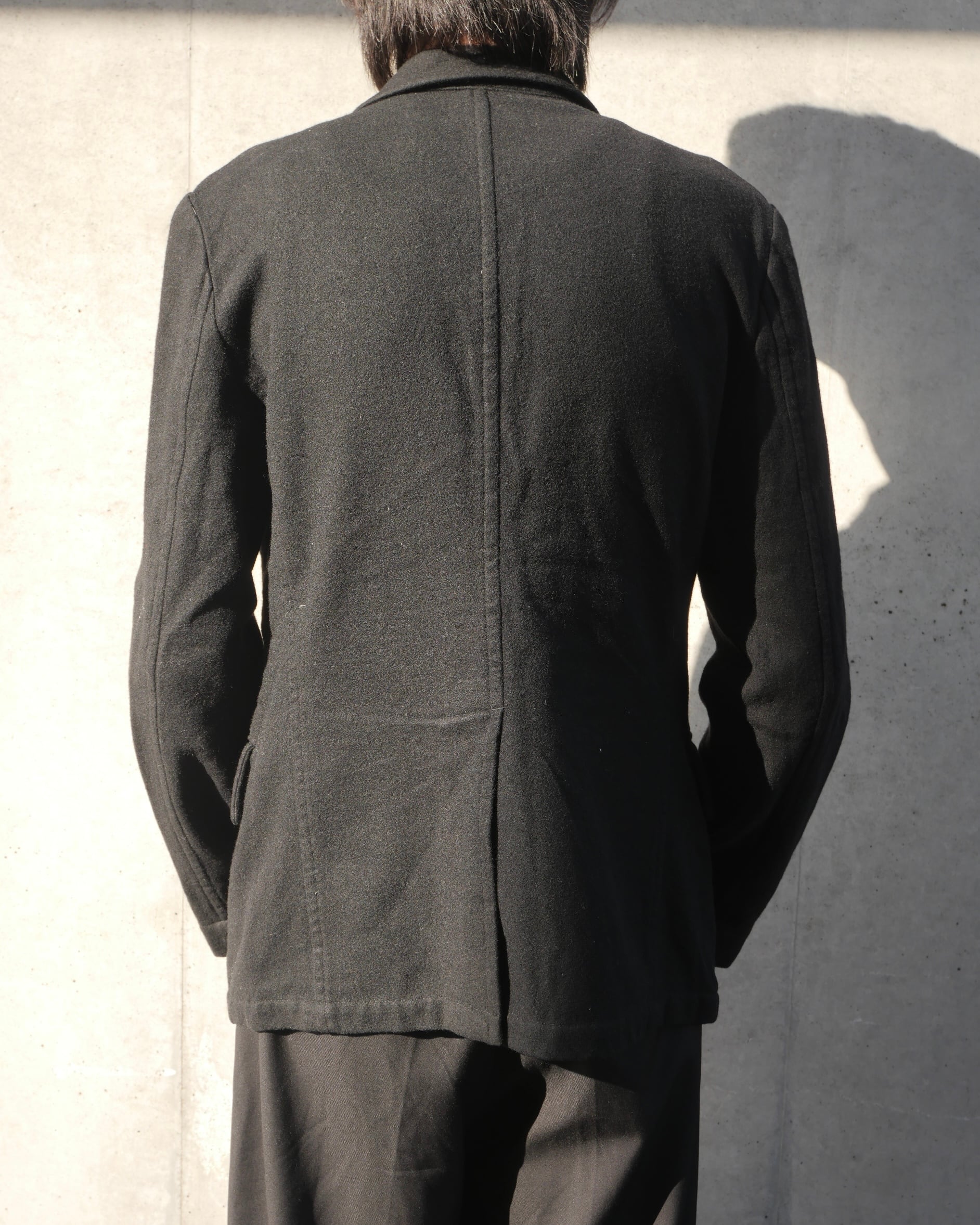 CABANE de ZUCCaによる、ミニマルかつ実験的なアプローチが際立つメルトンウール素材のテーラードジャケット。