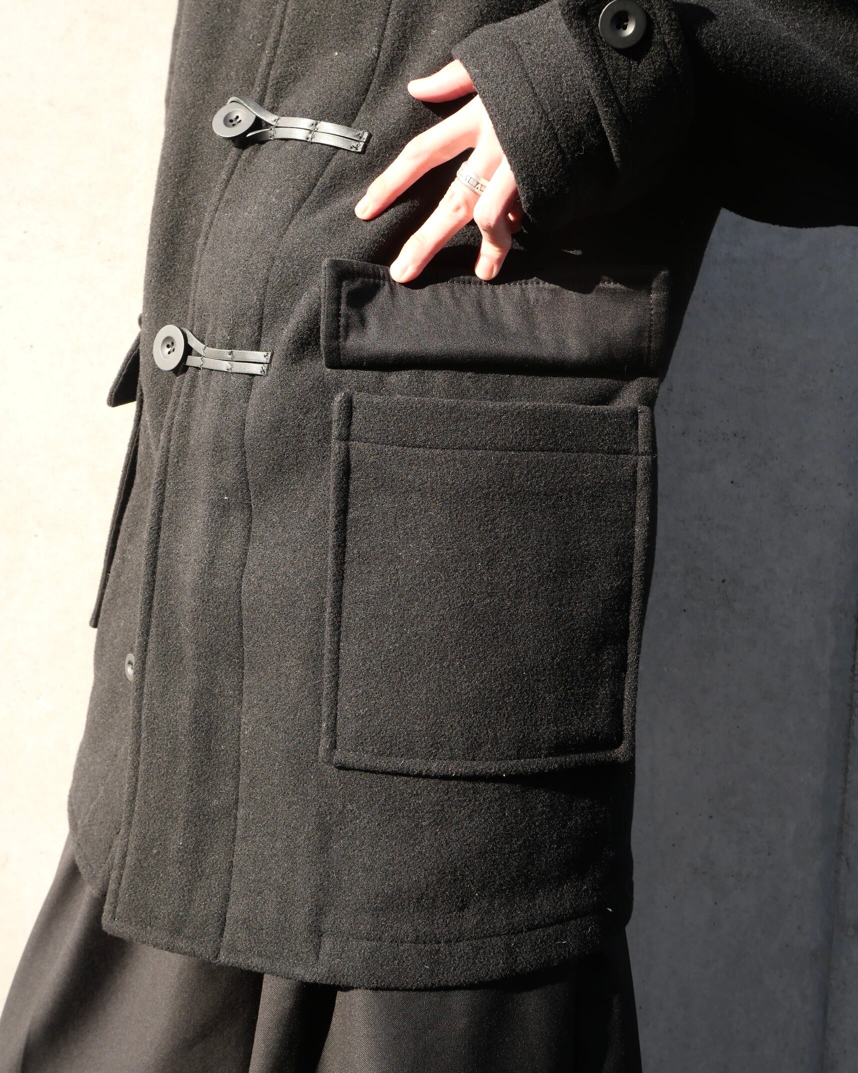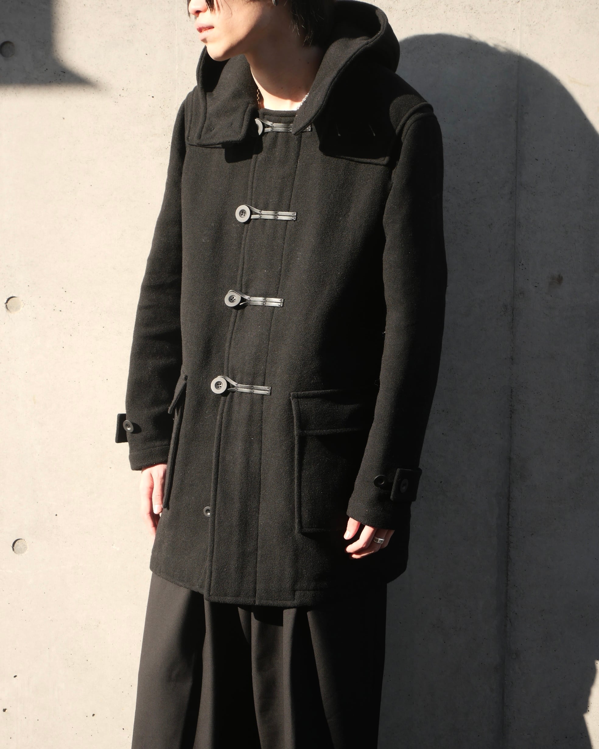 トグルではなくボタン×レザーループ仕様にすることで、ダッフル特有のカジュアルさを抑え、ミニマルで都会的な印象に昇華。フード周りや身頃の立体的なパターン設計により、着用時のシルエットも非常に美しく仕上がっています。
