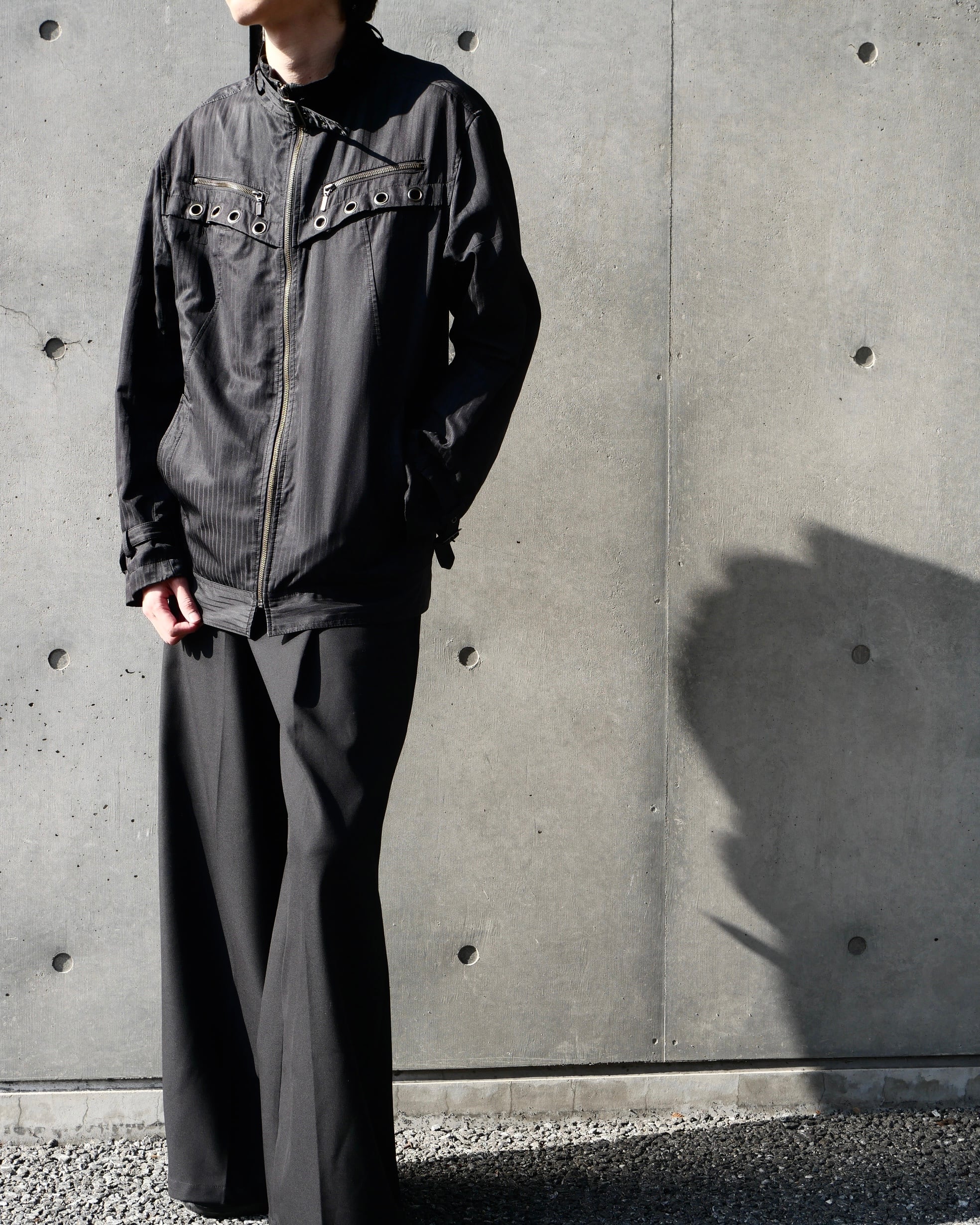 フロントに連なるアイレットディテールとジップワークが印象的な、ボンテージ要素を取り入れたデザインブルゾン。