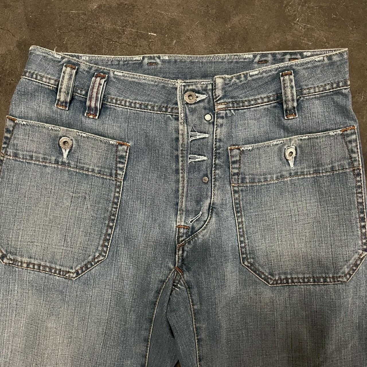 フロントに配置された大きめのベイカーポケット、スナップ仕様のフライ、程よくフェードしたインディゴの色味が特徴的な一本。