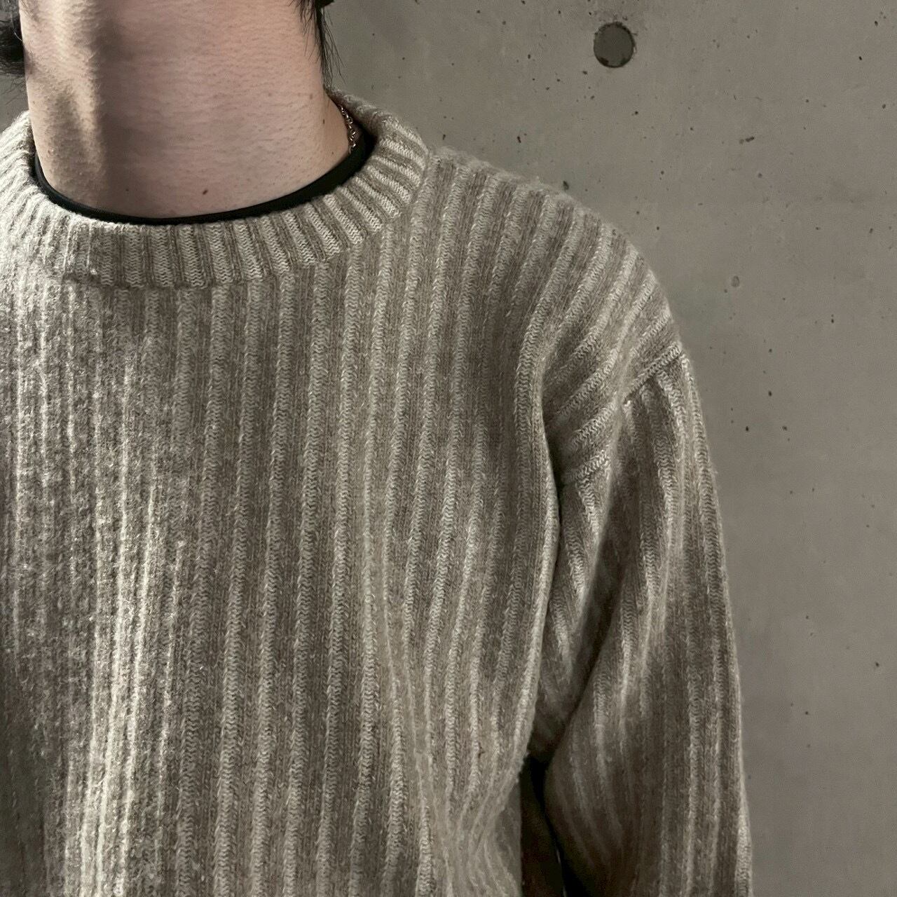 縦畝がはっきりと出たリブ編み仕様で、シンプルながらもしっかりと表情のある一着。
